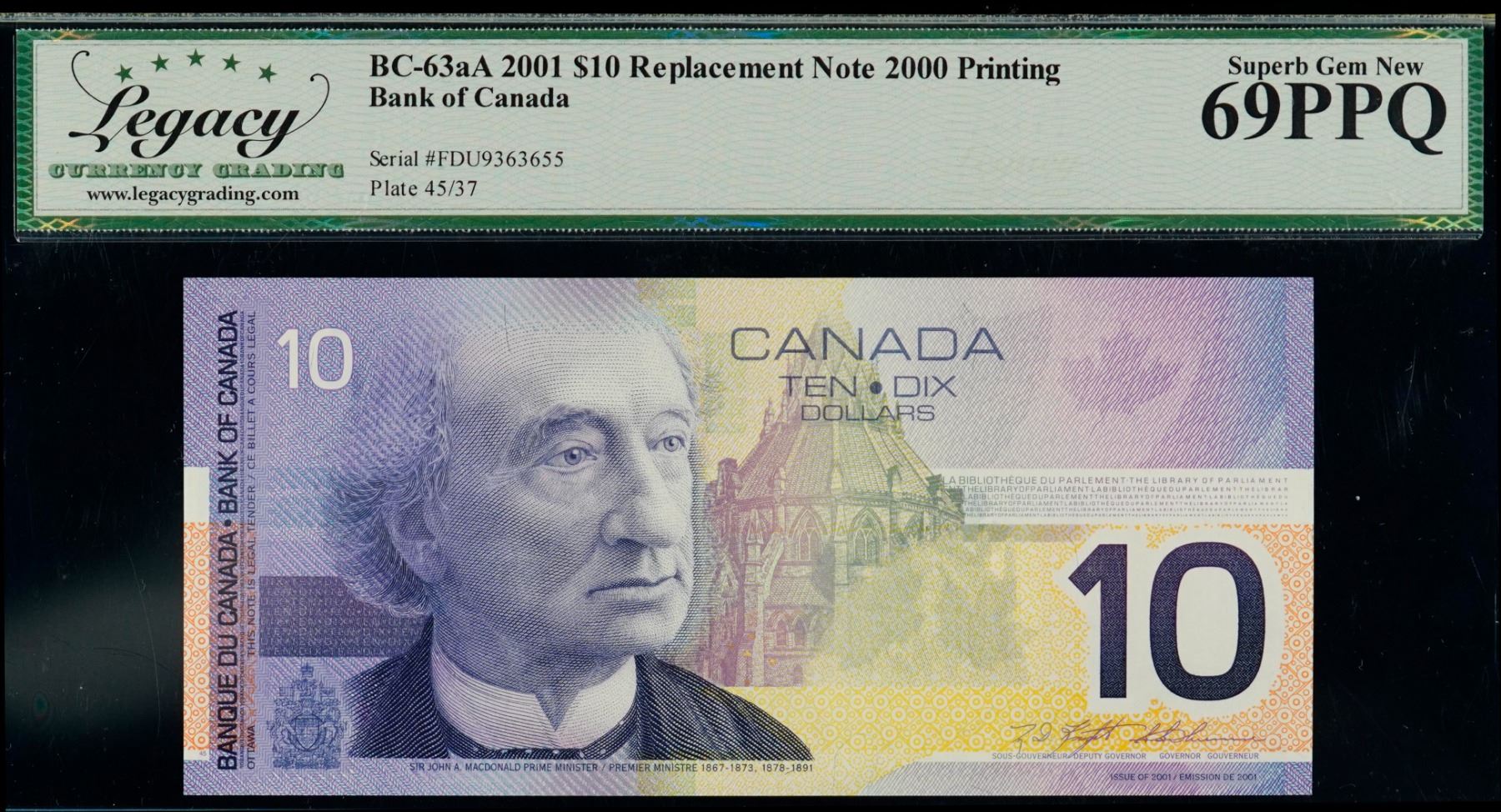 2001 $10 BC-63aA #FDU9363655 "Replacement" LCG Splendid Gem Uncirculated-69PPQ. A "Perfect" example. Expect spirited bidding.
