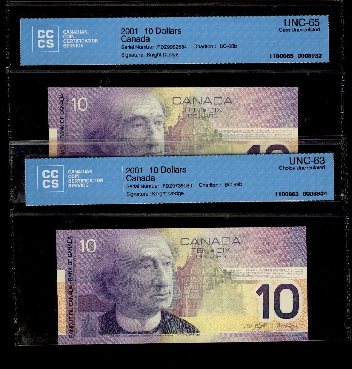 2001 $10 BC-63b #FDZ973958\9962534. Lot of two notes CCCS UNC63 and UNC65 respectively.