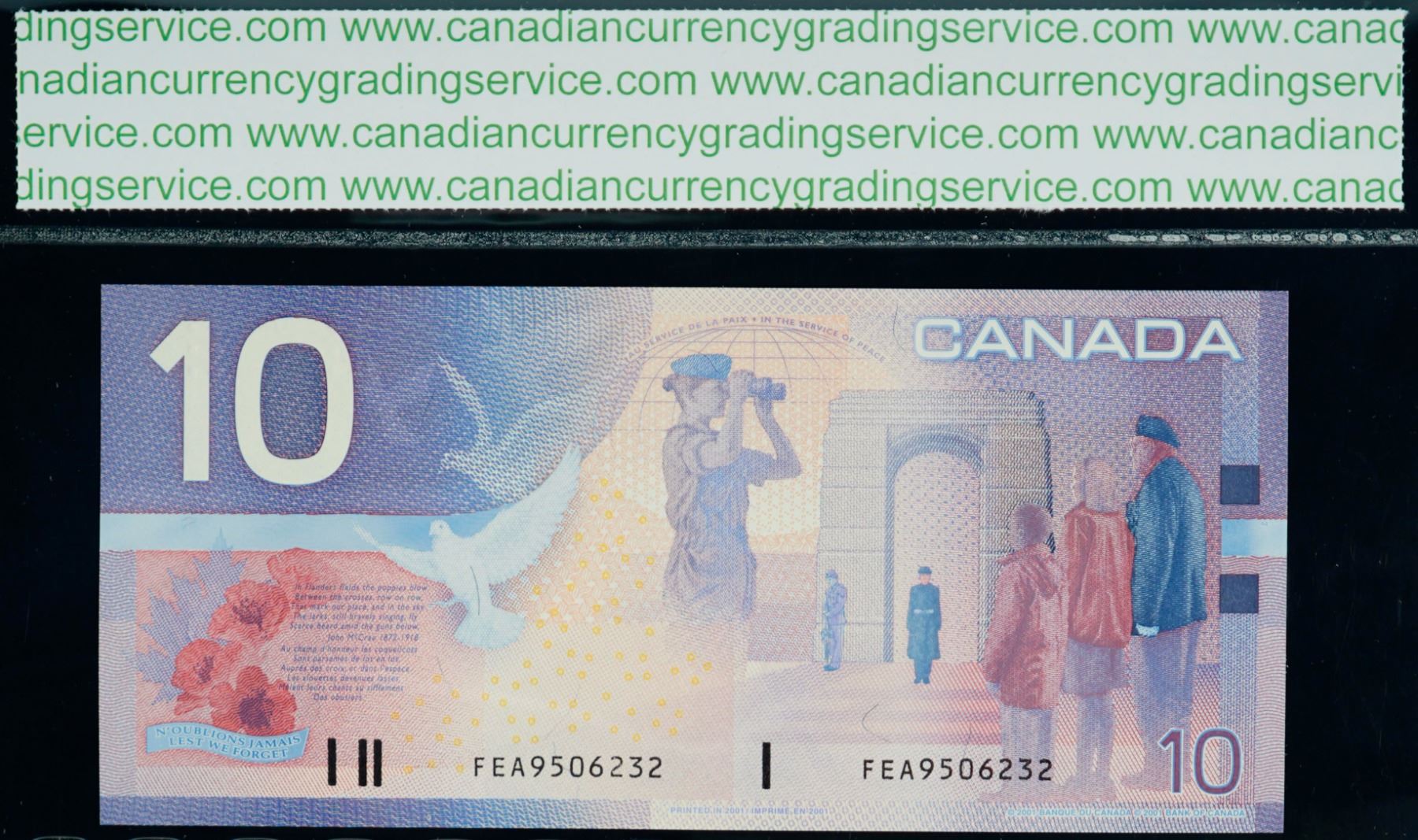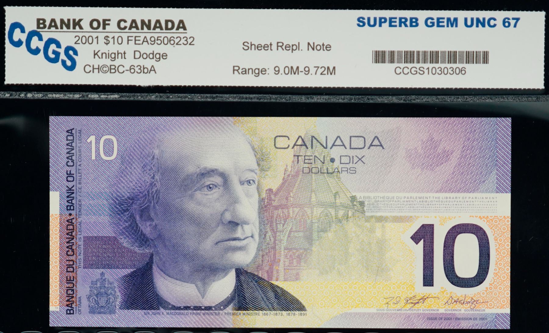 2001 $10 BC-63bA #FEA9506232 "9.0M - 9.72M" CCGS Superb Gem Uncirculated-67