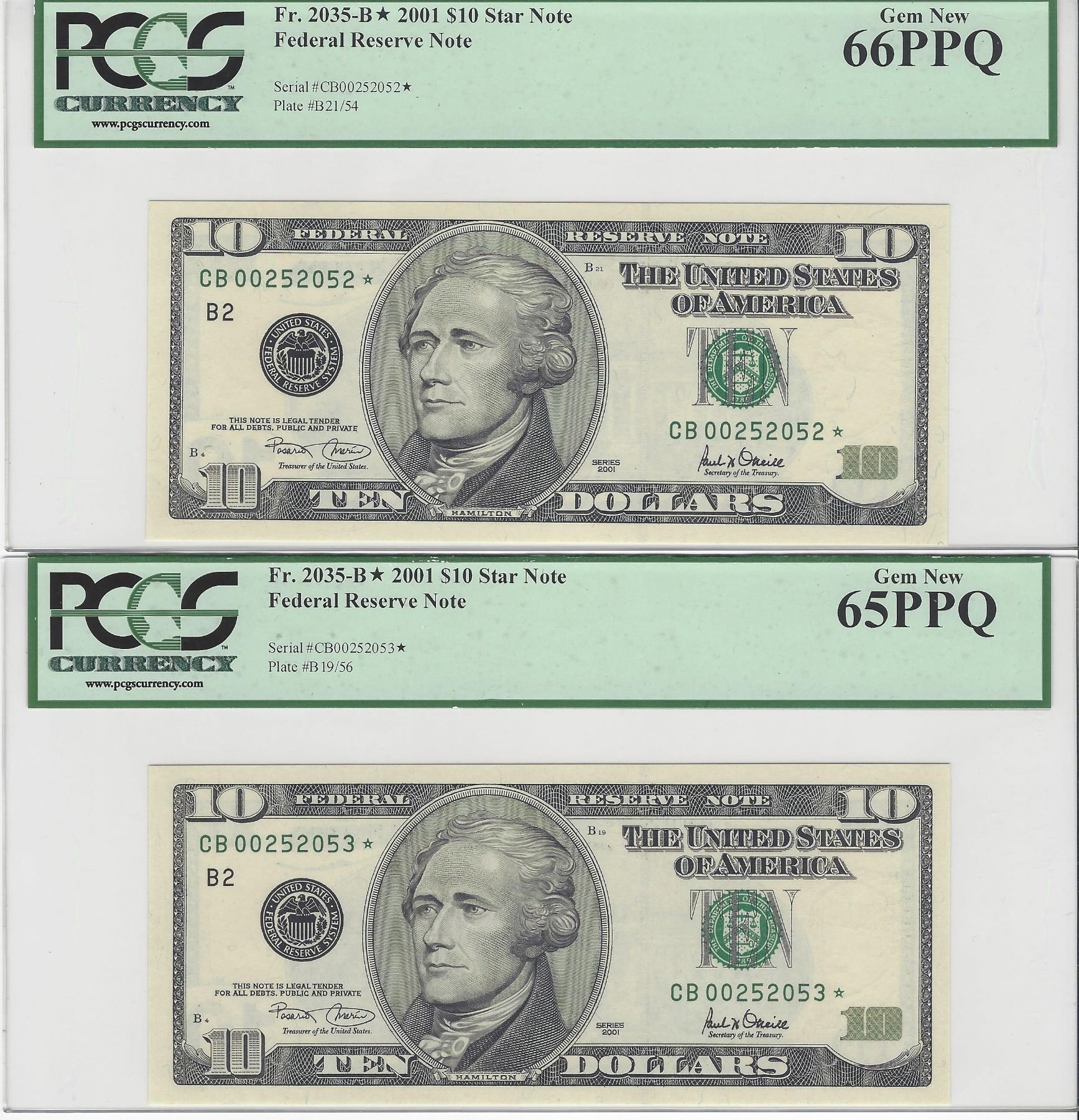 One pair of 2001 $10 Federal Reserve STAR Notes PCGS 66PPQ and 65PPQ.