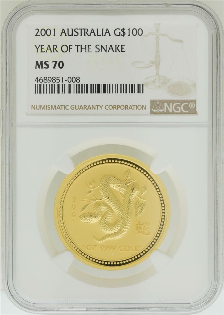 One 2001 $100 Australia Year of the Snake Gold Coin NGC MS70 . NGC Certified.