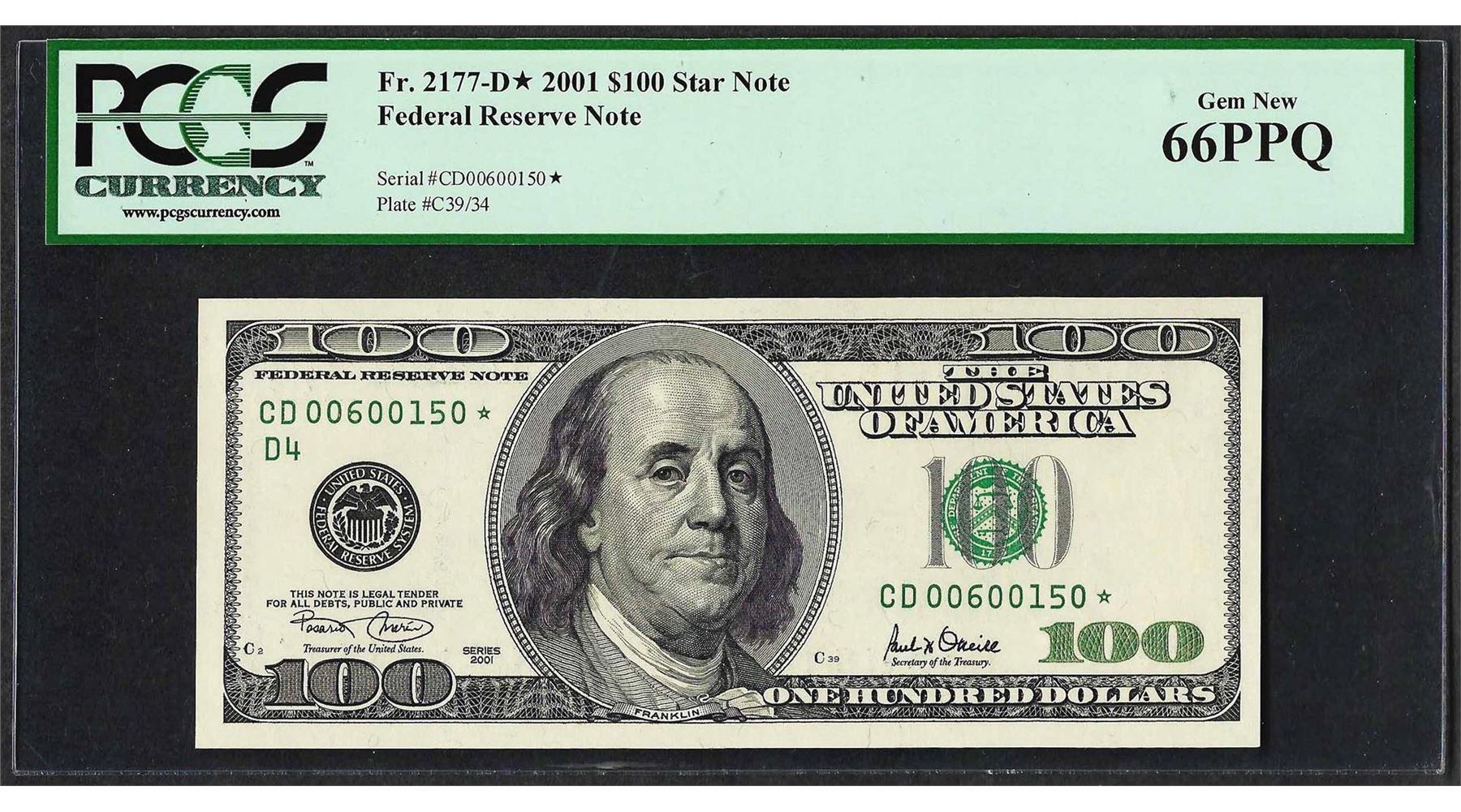 One 2001 $100 Federal Reserve STAR Note PCGS Gem New 66PPQ. PCGS Graded.