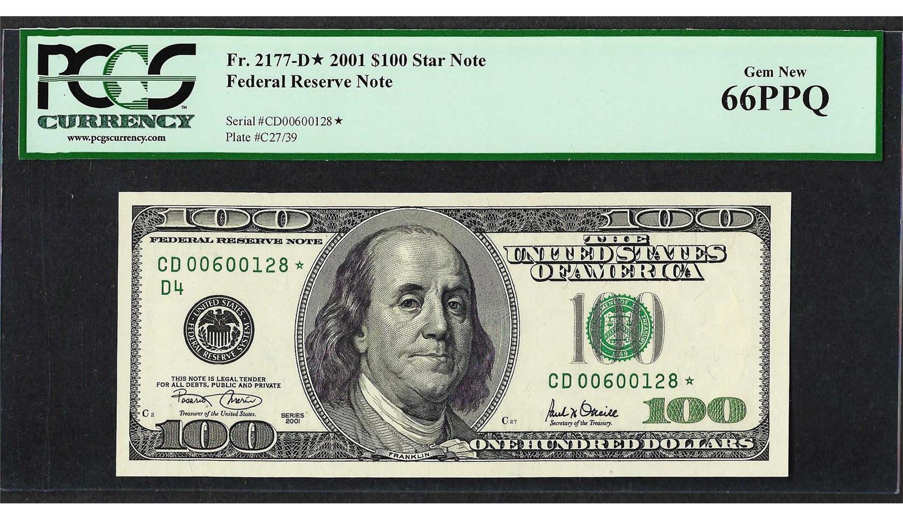 One 2001 $100 Federal Reserve STAR Note PCGS Gem New 66PPQ. PCGS Graded.