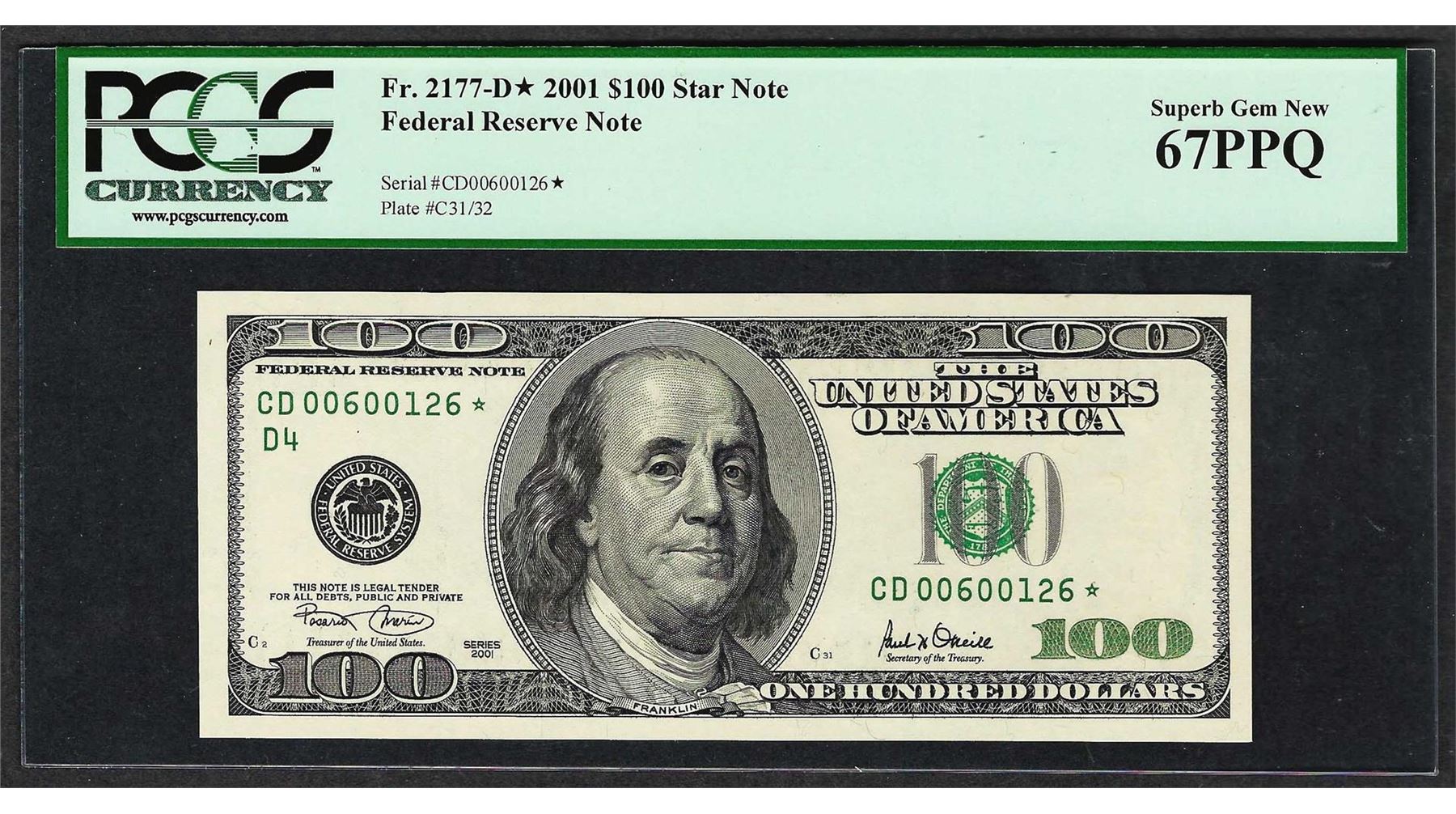 One 2001 $100 Federal Reserve STAR Note PCGS Superb Gem New 67PPQ. PCGS Graded.