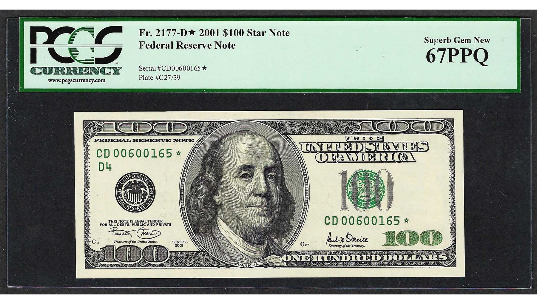 One 2001 $100 Federal Reserve STAR Note PCGS Superb Gem New 67PPQ. PCGS Graded.
