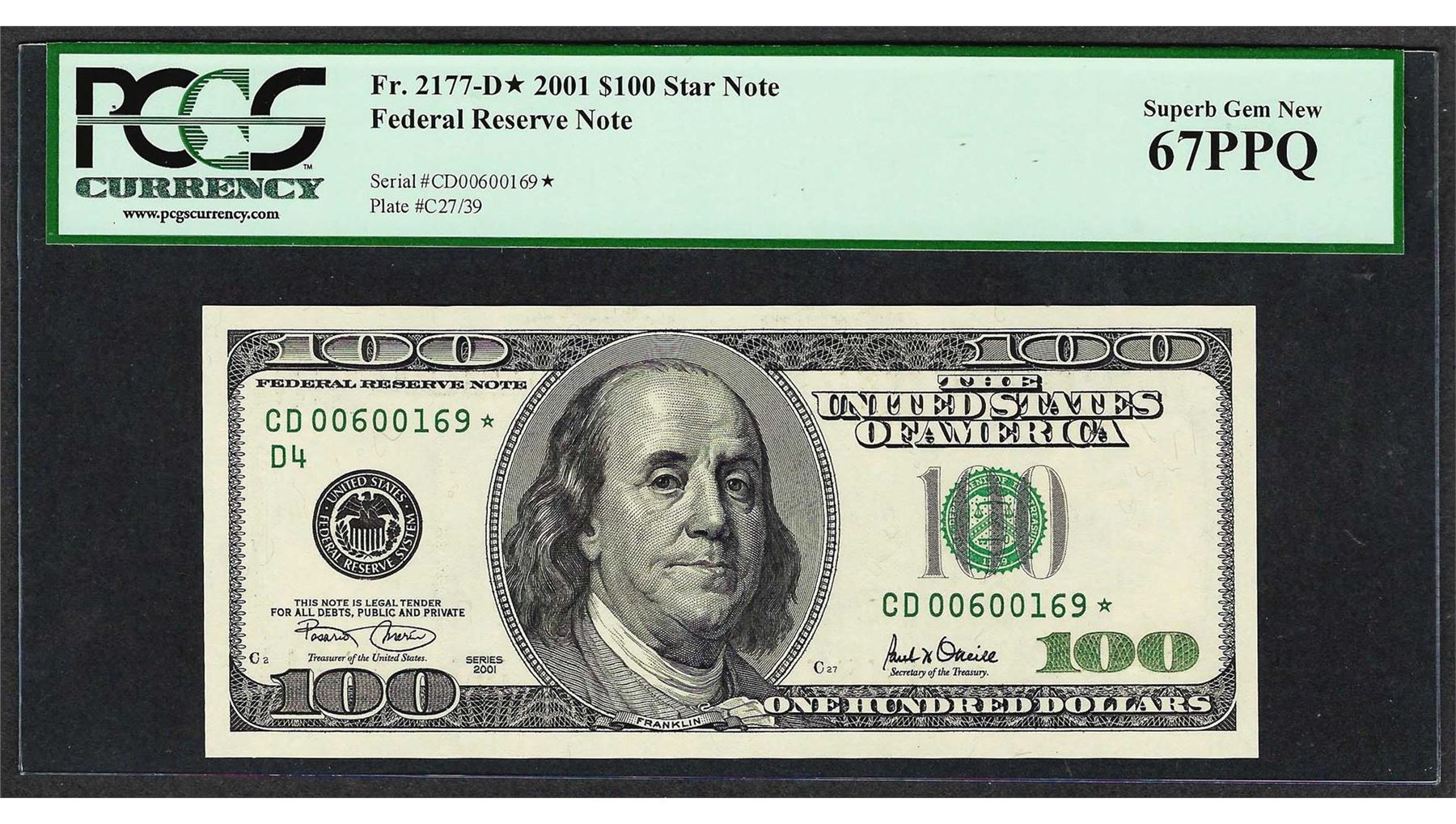 One 2001 $100 Federal Reserve STAR Note PCGS Superb Gem New 67PPQ. PCGS Graded.