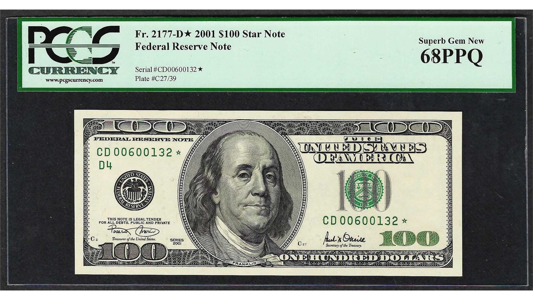 One 2001 $100 Federal Reserve STAR Note PCGS Superb Gem New 68PPQ. PCGS Graded.