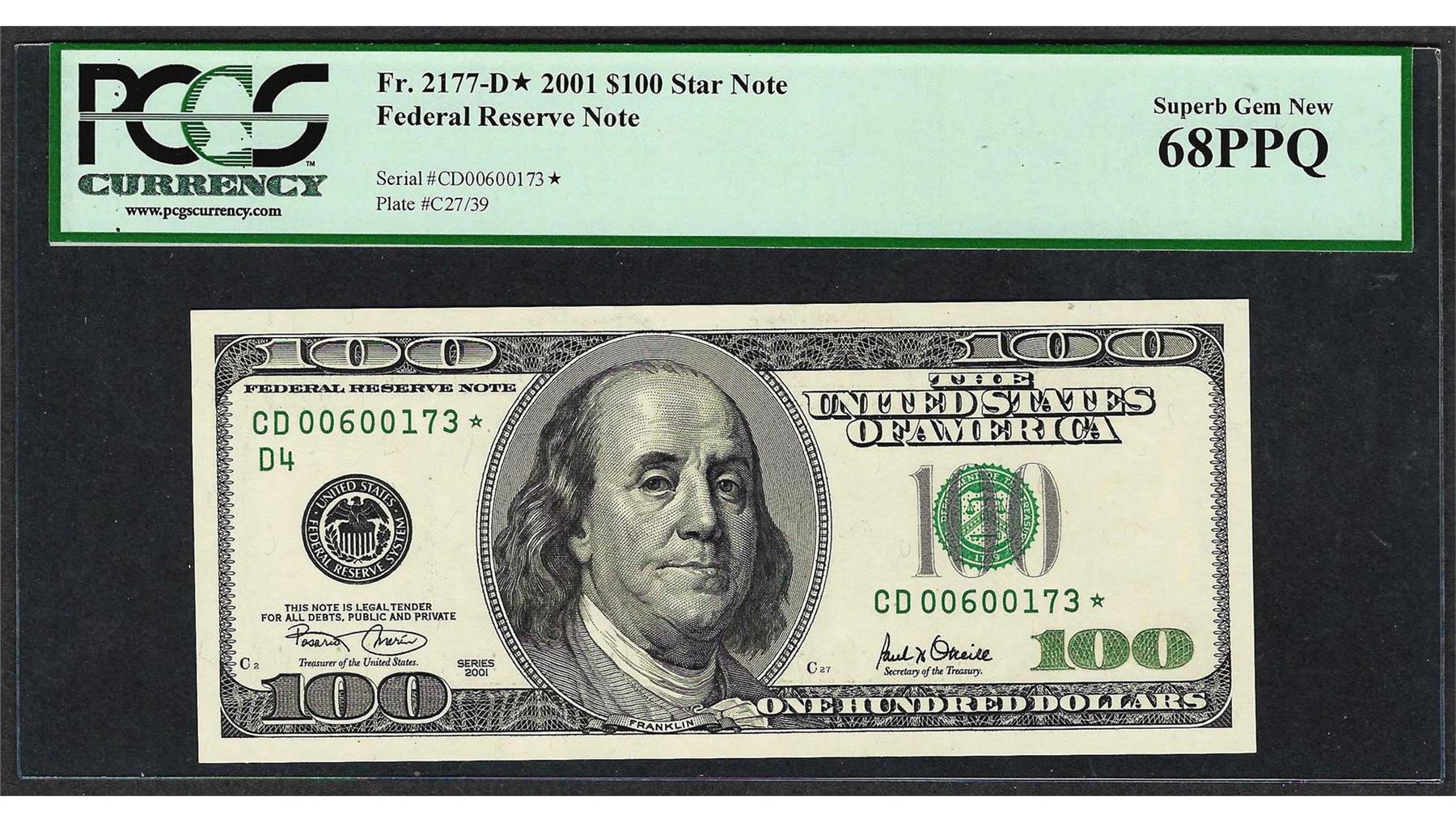 One 2001 $100 Federal Reserve STAR Note PCGS Superb Gem New 68PPQ. PCGS Graded.