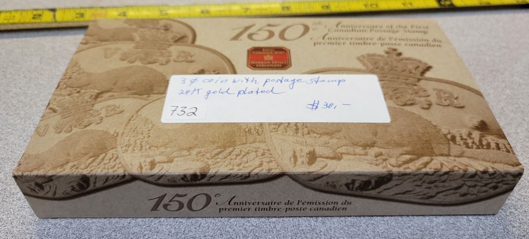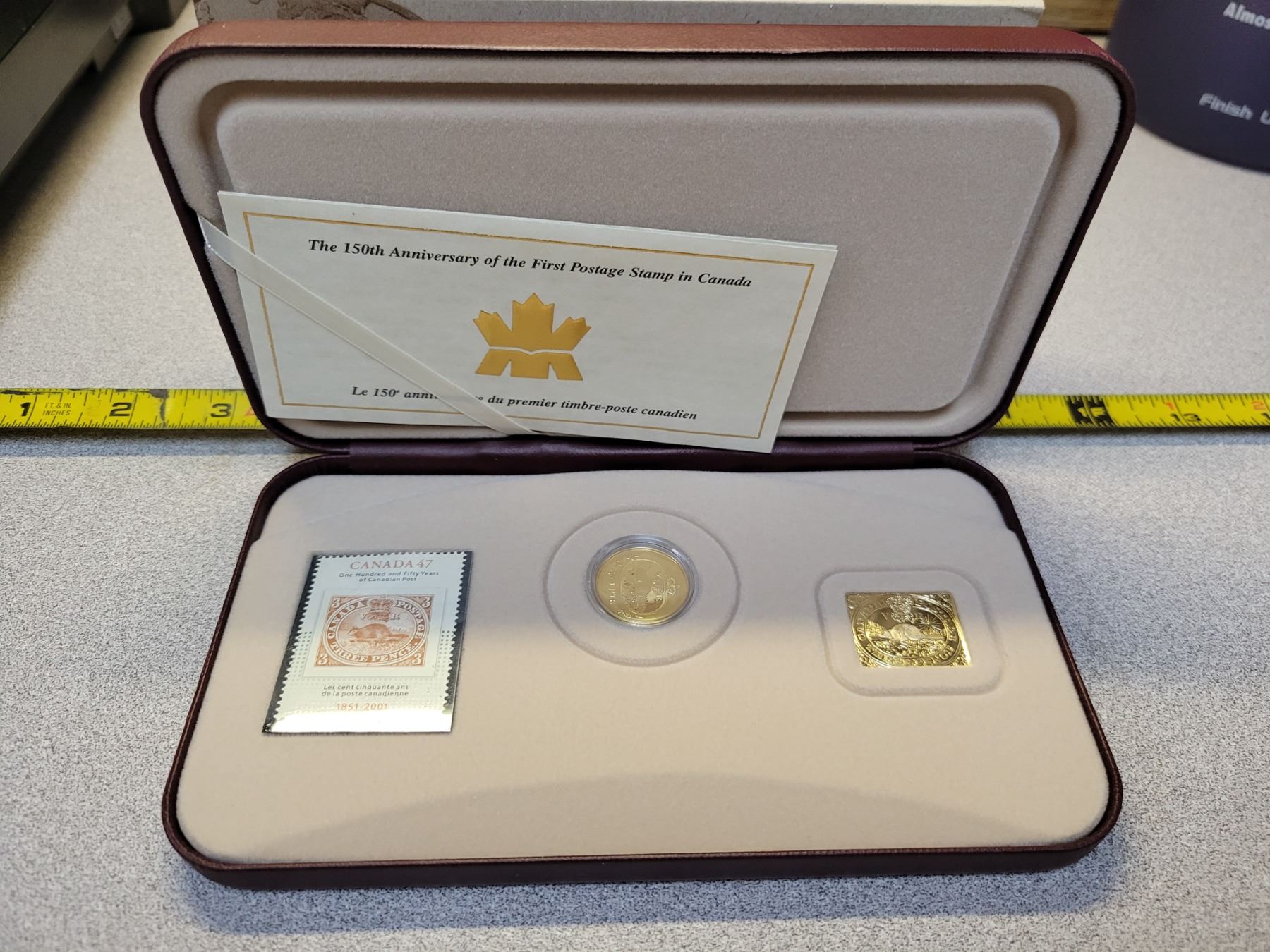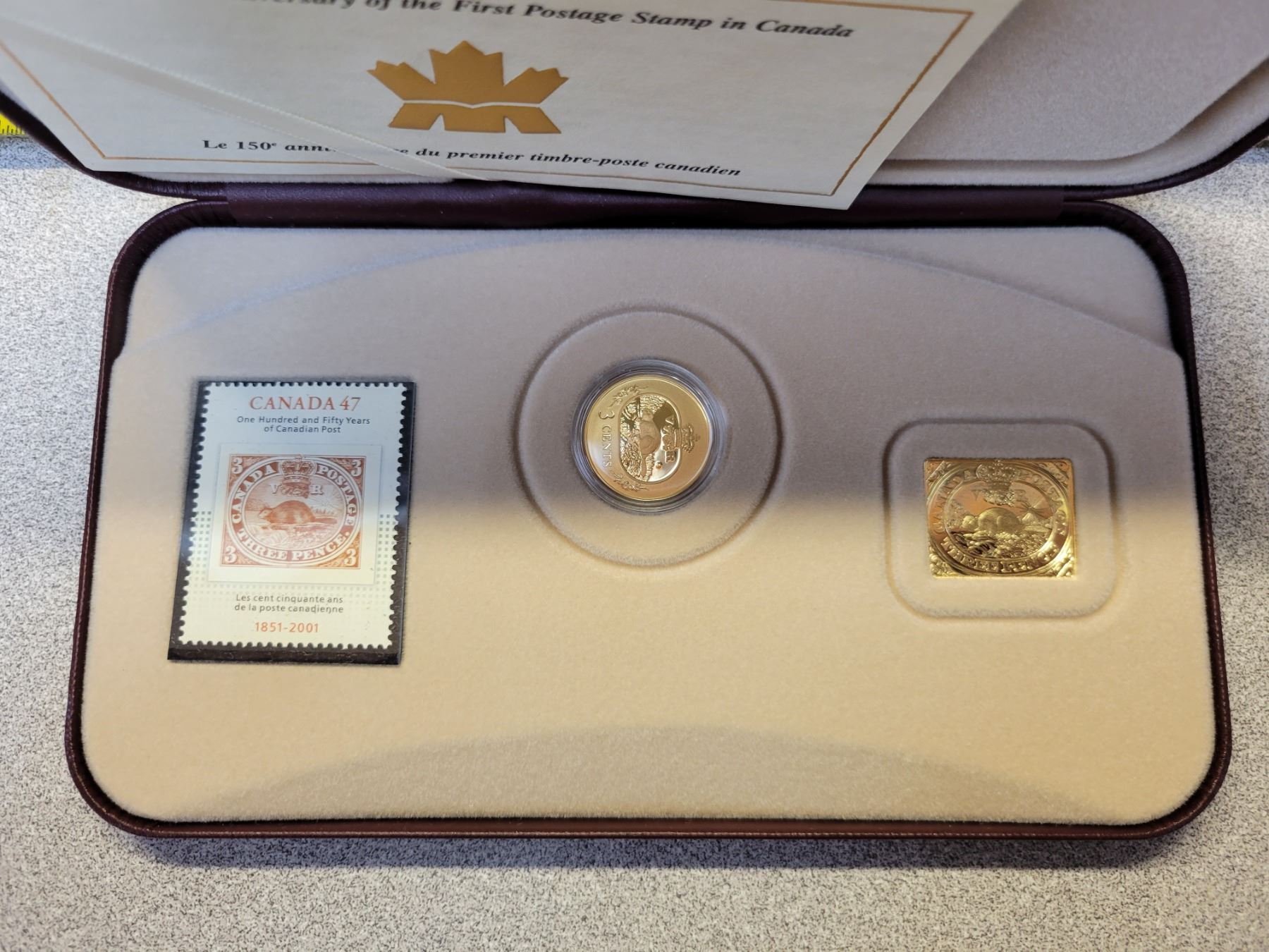 2001 150th Anniversary of the First Postage Stamp in Canada. 3-piece set includes Sterling Silver 3 Cents Beaver coin covered in 24-karat Gold plus a stamp that depicts the first Canadian Stamp. Housed in its original case & box of issue.