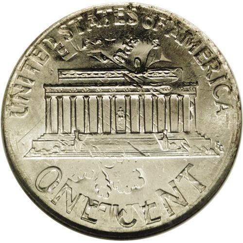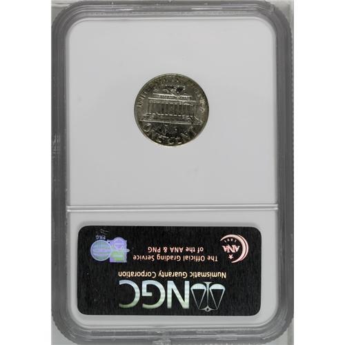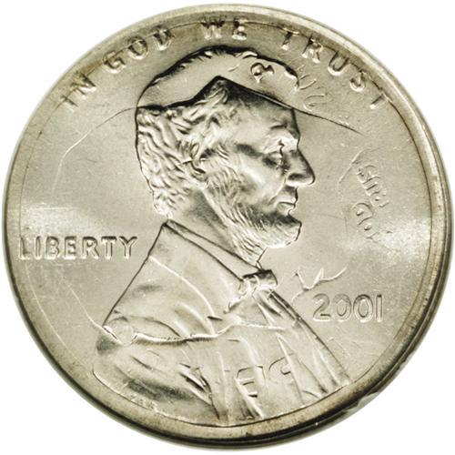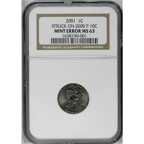 <B>2001<1C> Lincoln Cent--Struck on 2000 Dime--MS63 NGC.</B></I> This is an extremely important double-date <I>and</B></I> double-denomination coin, a 2000/2001 "11-cent" piece. Obverse on obverse orientation with approximately 135 degrees rotation between the two designs. The date from the Roosevelt dime is visible near Lincoln's forehead. Highly lustrous light gray surfaces with a hint of gold toning along the border.