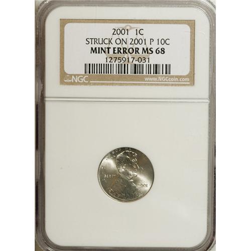 <B>2001 1C Lincoln Cent--Struck on a 2001-P Dime--MS68 NGC.</B></I> The dime date and mintmark are legible, and the cent date is bold. Roosevelt's portrait is nearly inverted relative to the memorial. The flame of the torch resides beneath Lincoln's bowtie. Unimprovable luster brightens this unabraded and lightly toned Superb Gem.<BR><BR><b>Shipping:</b> Coins & Currency (<a target="_blank" href="http://www.heritageauctions.com/common/shipping.php">view shipping information</a>)