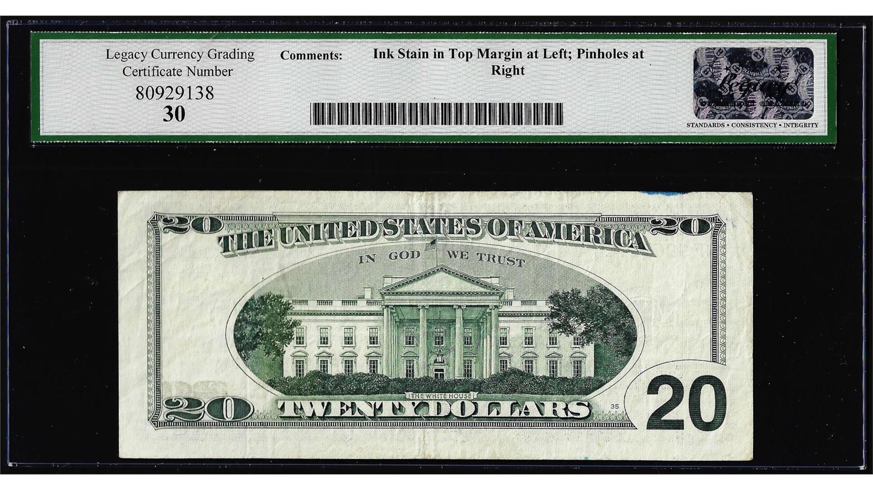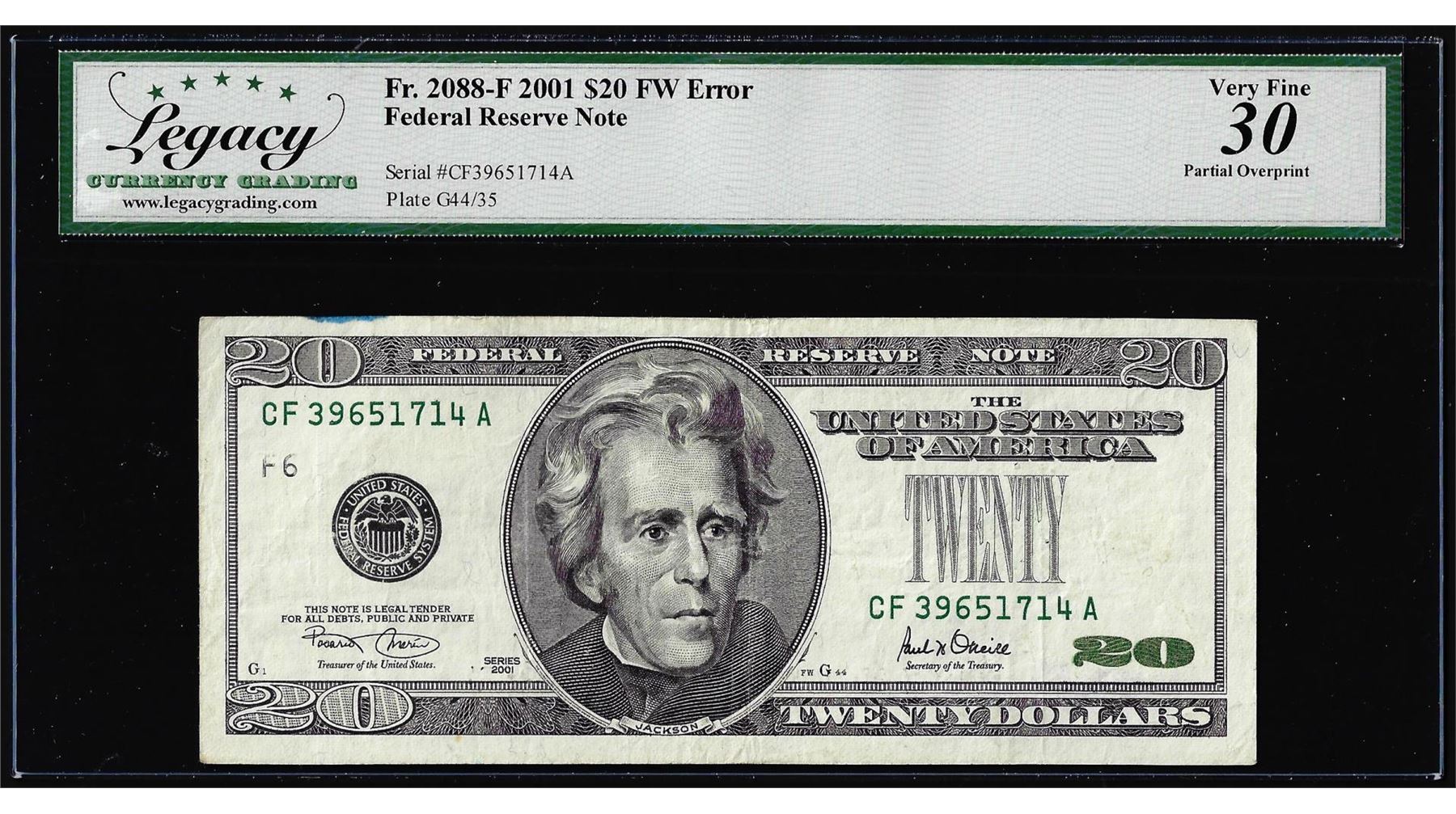 One 2001 $20 Federal Reserve Note Partial Overprint Error Fr. 2088-F Legacy Very Fine 30. Legacy Graded.