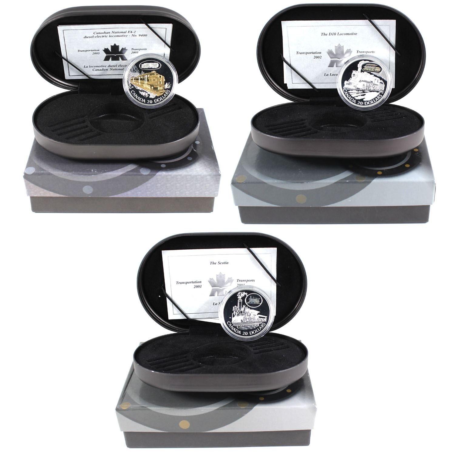 2001, 2002, 2003 Canada $20 Transportation Series - Train Sterling Silver Coin Collection. You will receive the 2001 The Scotia, 2002 D-10, and 2003 CNR FA-1 Diesel Electric. 3pcs.