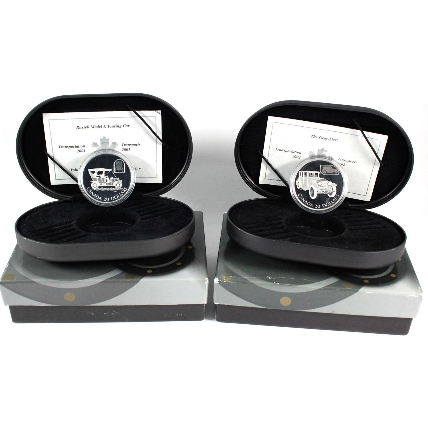 2001 & 2002 Canada $20 Transportation Car - 2001 Russell Light Four & 2002 Gray-Dort 25-SM Sterling Silver Coins (Capsules are scratched). 2pcs