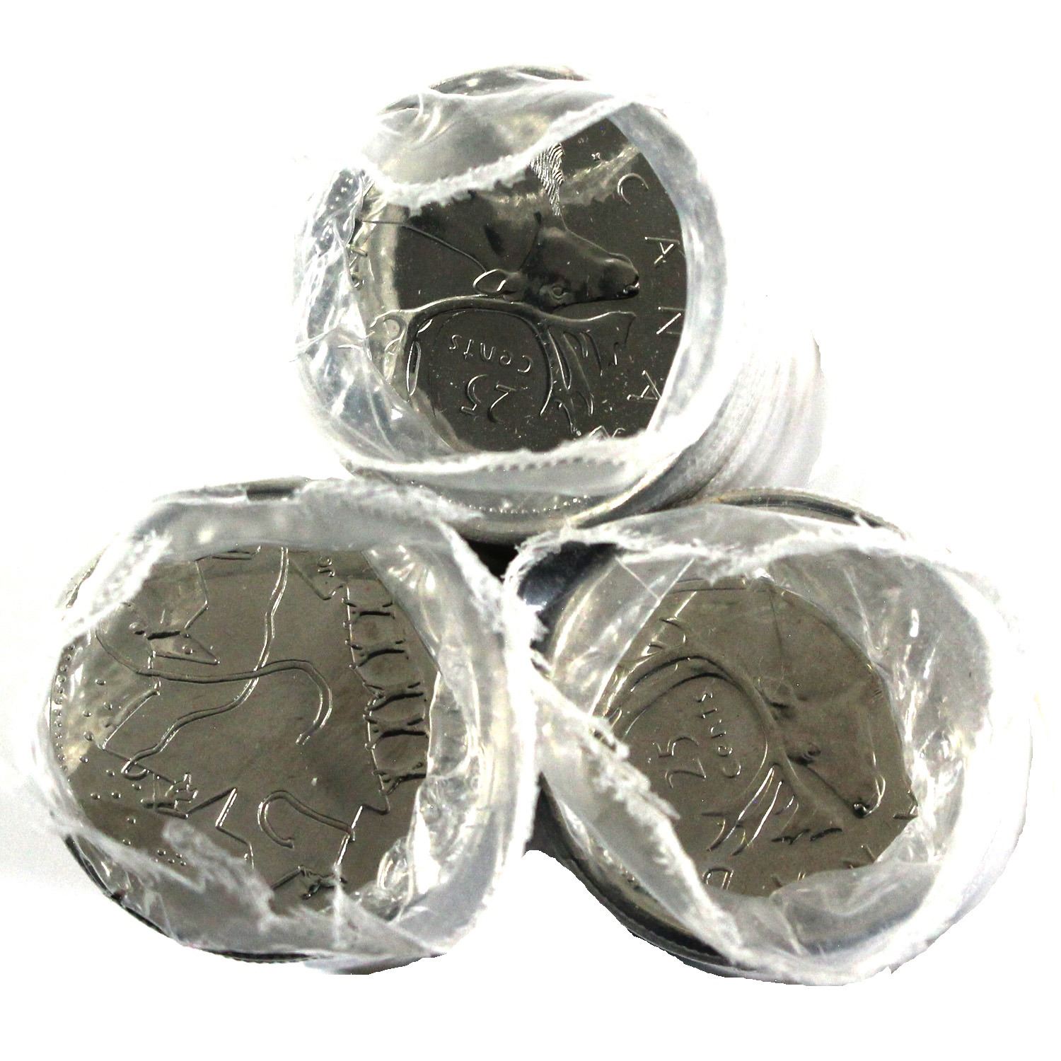 2001, 2002P Canada Day, 2002P Caribou, 25-cent Original Roll of 40pcs. One end of the 2001 roll has a small tear. 3 rolls.