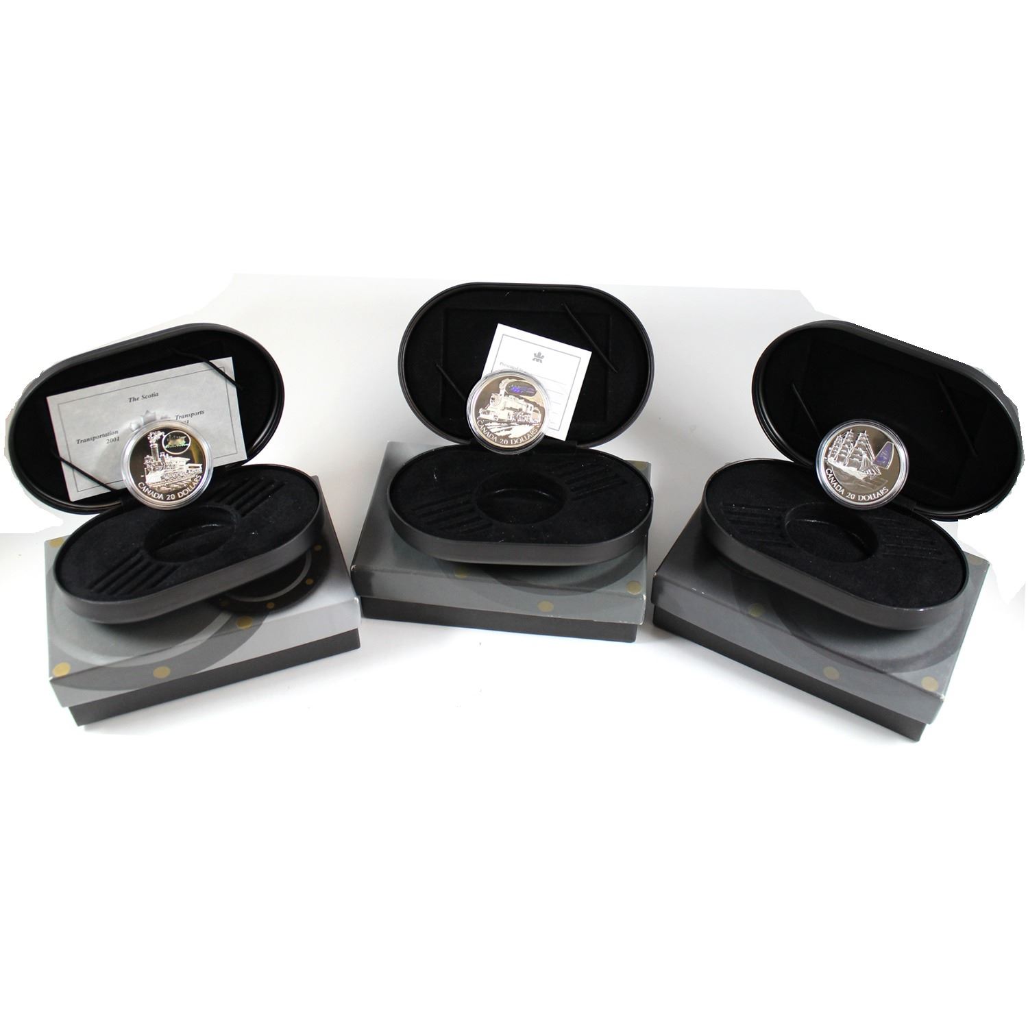 2001-2003 Canada $20 Transportation Series Fine Silver Coins. This lot includes: 2001 The Scotia Train, 2002 Canadian Pacific D10 Locomotive (Missing COA), & 2002 William D Lawrence Ship (missing COA). 3pcs