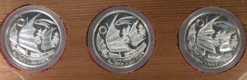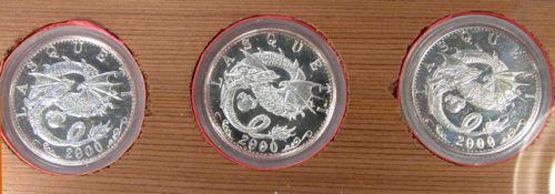 2001 - 2003 Lasqueti Mint China Cloud Brilliant Uncirculated Set. Three pieces: 2001 (2000 One Dot), 2002 (2000 Two Dot) and 2003 (2000 Three Dot). All 1/2 ounce .999 Silver, with Certificate Number 9 of 10 Sets