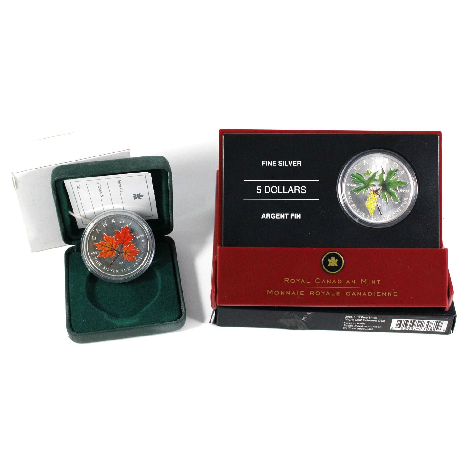 2001 & 2005 Canada 1oz Coloured Silver Maple Leafs (2001 coin lightly toned, capsule lightly scratched, case has some residue & 2005 sleeve has a surface tear). 2pcs (TAX Exempt)