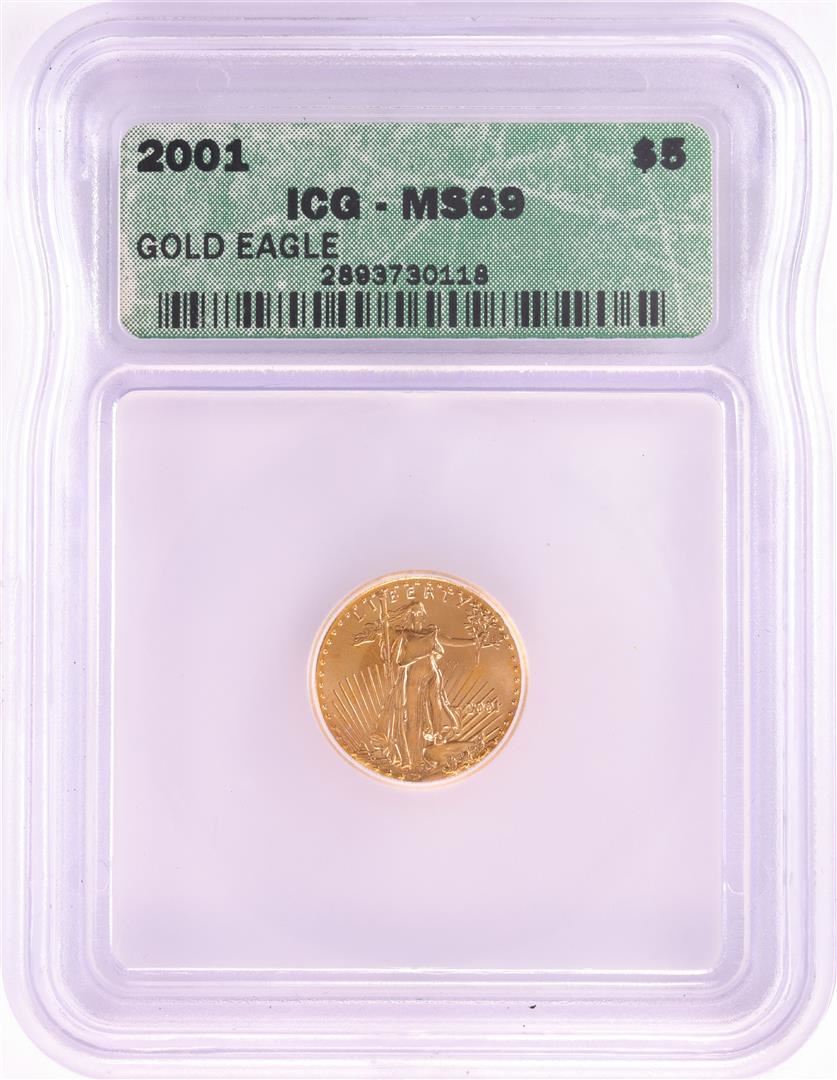 One 2001 $5 American Gold Eagle Coin ICG MS69. ICG Certified.