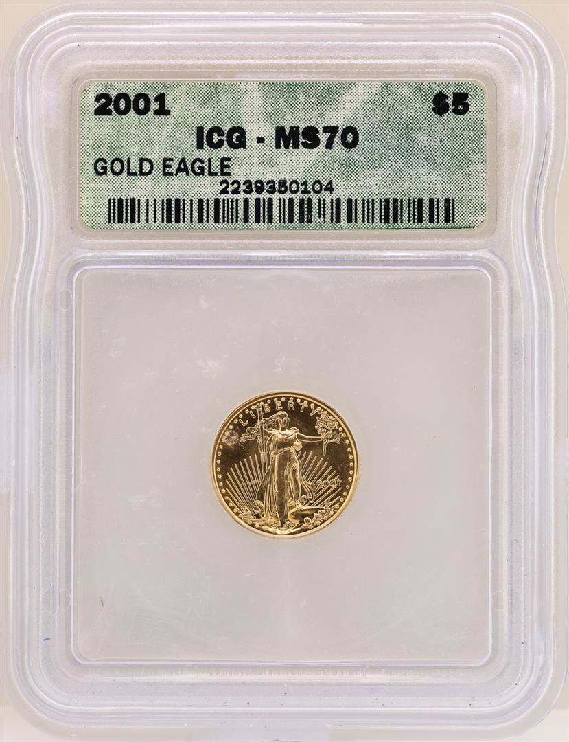 One 2001 $5 American Gold Eagle Coin ICG MS70. ICG Certified.
