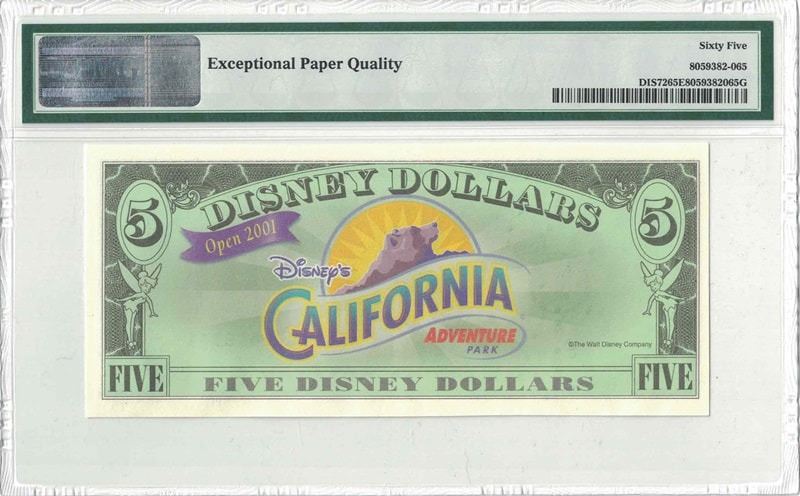 One 2001 $5 Disney Dollar PMG 65EPQ.
