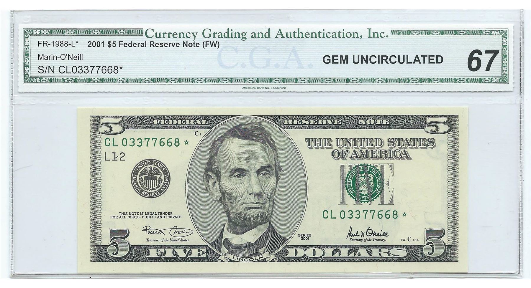One 2001 $5 Federal Reserve Note