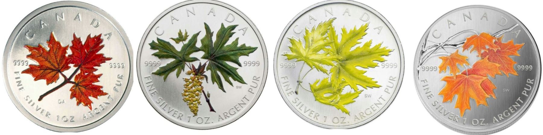 2001 $5 Silver Maple Leaf Coloured, 2005, 2006, and 2007, lot of 4 coins coloured.