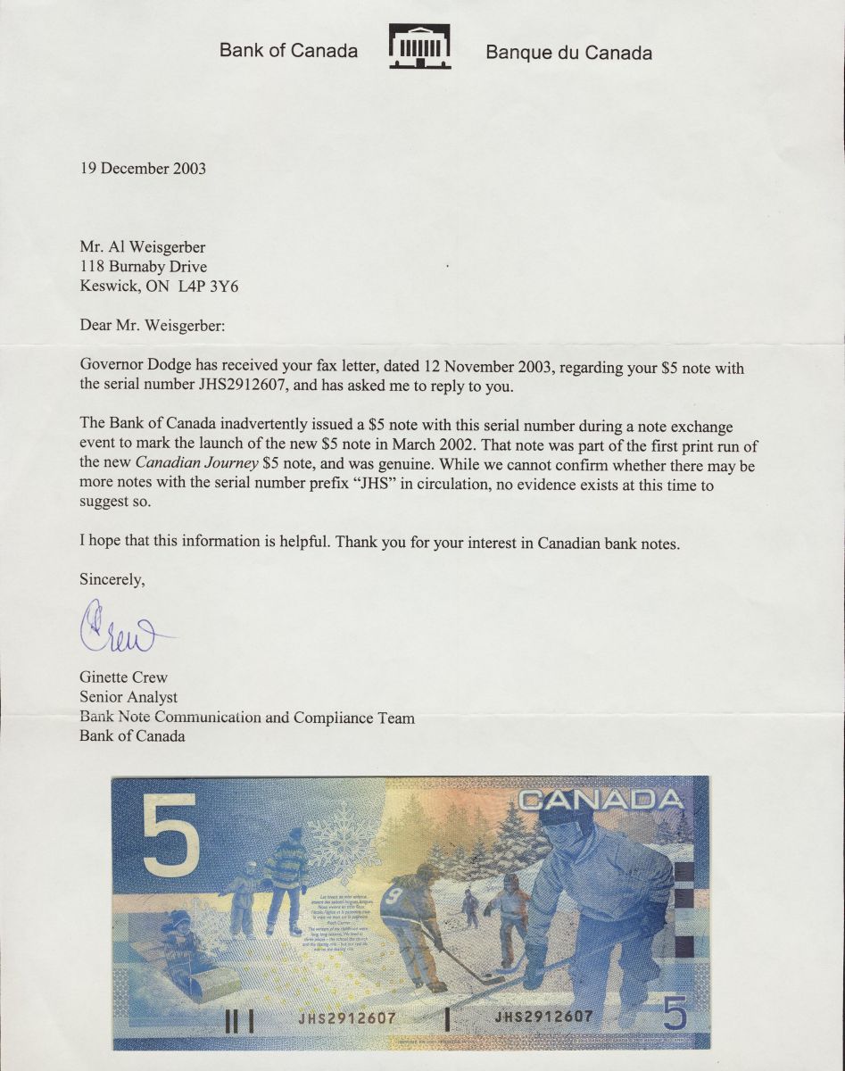 2001 $5 UNIQUE JHS2912607 EXPERIMENTAL NOTE. As confirmed by the Bank of Canada by official letter dated 19 December 2003, this note was inadvertently issued during a note exchange event to mark the launch of the new $5 note in March 2002. This note was part of the first run of the new Canadian Journey $5 note and is indeed genuine. While the Bank of Canada cannot confirm wether any other notes were inadvertently put into circulation, they do agree that there is no evidence that leads them to believe that any other exist at this time. Even Even the Bank of Canada is missing this note. Expect high bidding as this is believed to be the only privately owned example. Comes with 2002 $5 #JHS2912607, same serial number in AU-UNC.