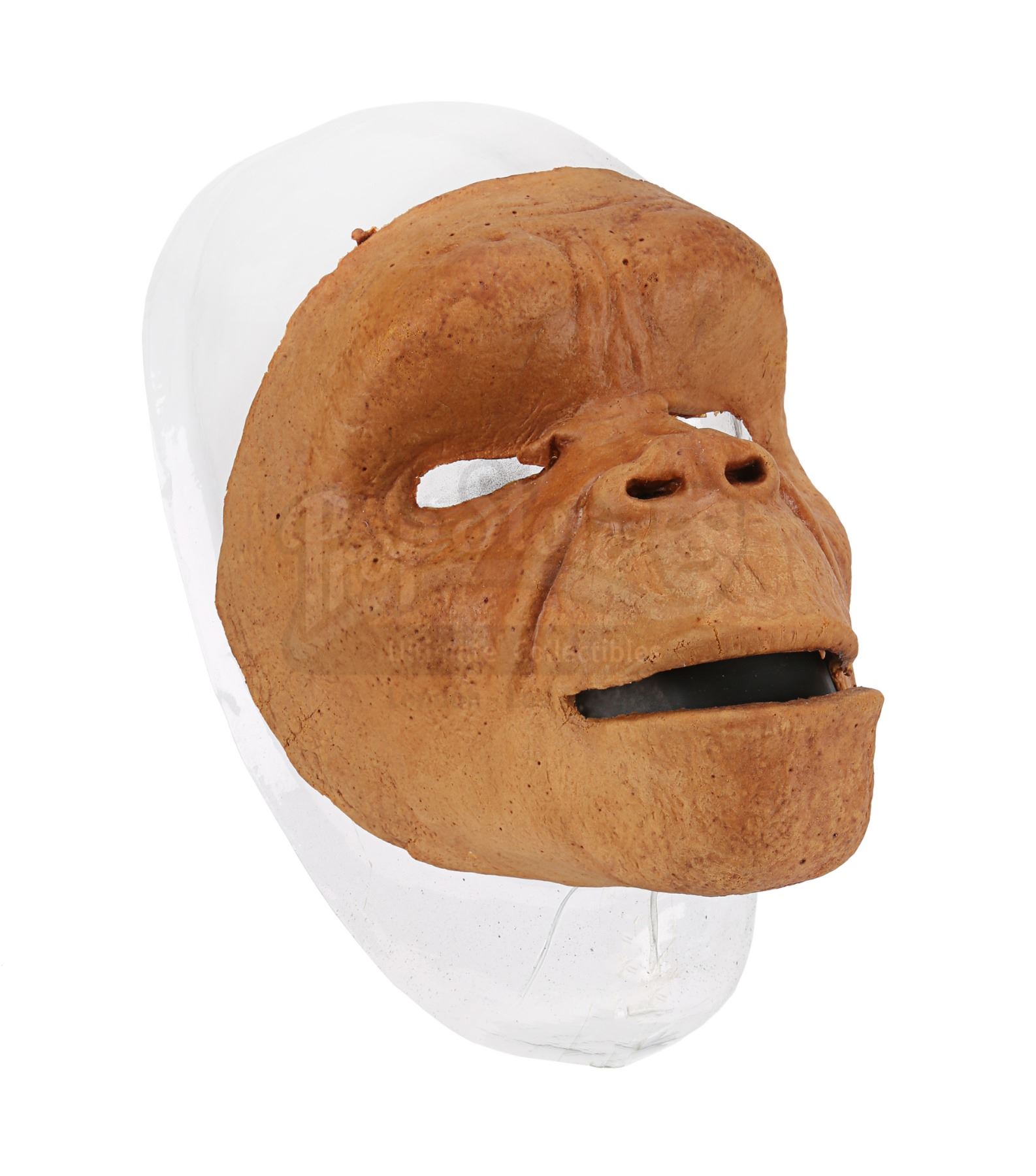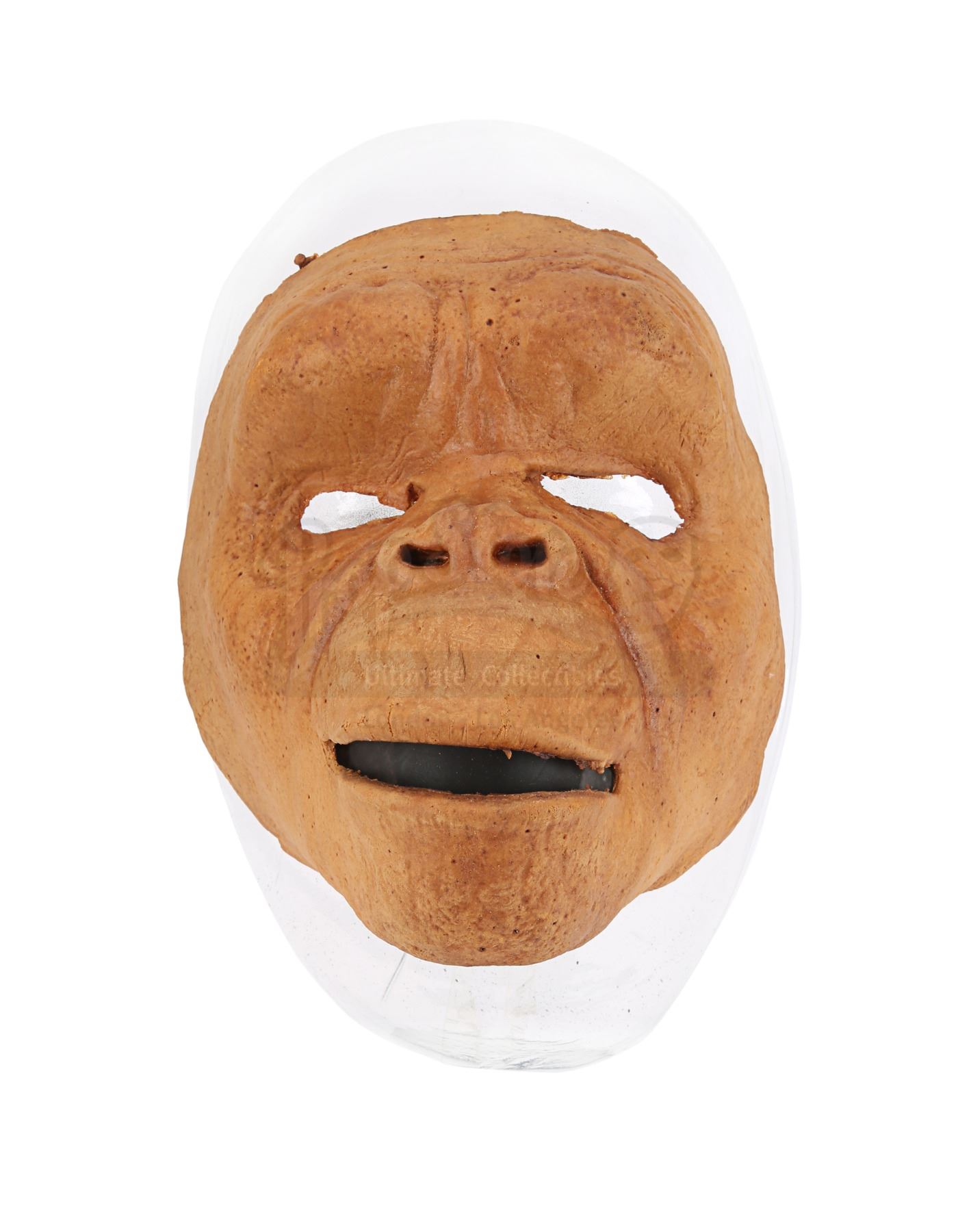 Created by renowned make-up and special effects technician Stuart Freeborn, the brown foam-latex prosthetic face features a pronounced brow ridge, eye holes, a detailed nose and a slightly opened mouth. The interior is labelled "Dan, ED6, C3", referring to credited ape performer Danny Grover, and the mask rests on a plastic face support.