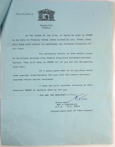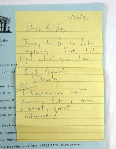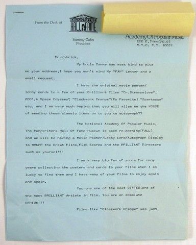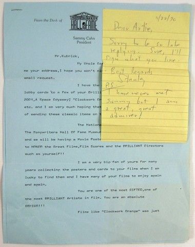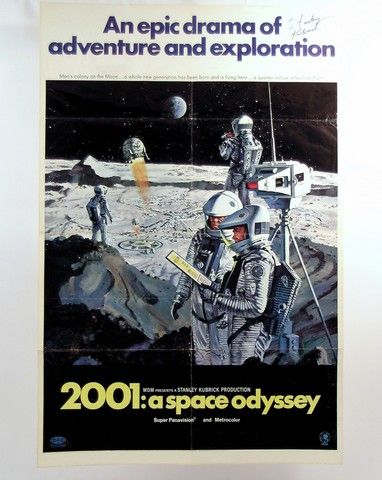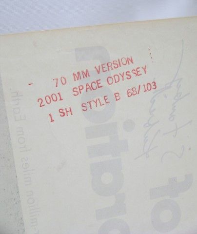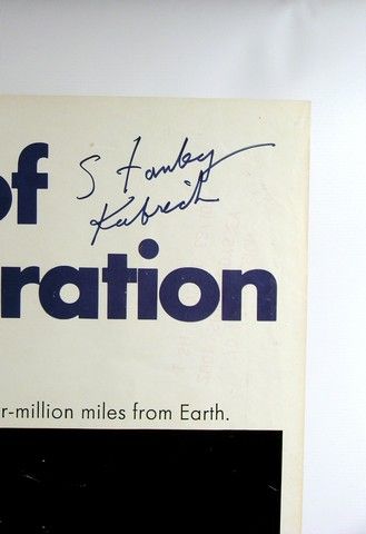 From the film that changed the course of motion pictures forever and inspired a whole new generation of filmmakers, many believe that Stanley Kubrick's "2001: A Space Odyssey (1968) is the greatest science fiction movie ever made, if not one of the greatest films of all time. This is an original poster from the 1968 release which shows the artwork of award winning illustrator Robert McCall. The poster itself is a rare collectable, however, to make this one of the all time treasures for any "2001" fan, it is personally autographed by Stanley Kubrick himself. Kubrick was well known as an extremely private man who rarely gave out autographs, especially on anything connected to one of his productions, which makes this a rare bit of grand movie memorabilia. Has fold marks and some wear. The poster was signed by Kubrick for the Songwriter's Hall of Fame Museum, which was founded by legendary songwriter Sammy Cahn. Because Kubrick was a huge fan of Cahn's work he gladly signed the poster, and included a personal note with the poster. This includes the original extremely rare handwritten note by Stanley Kubrick to Arte Kern, nephew of Sammy Cahn, and chief curator of the museum which reads: "Sorry to be so late replying. Sure I'll sign what you have. Best Stanley. PS I have never met Sammy but I am a great, great admirer!" Approx 41"x27".