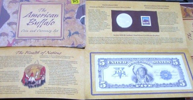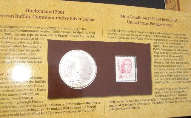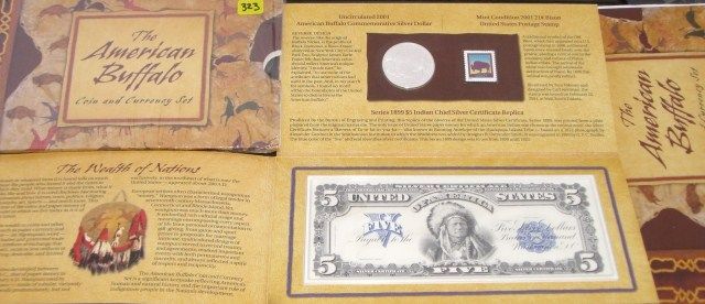 2001 AMERICAN BUFFALO COIN-STAMP & CURRENCY SET *RARE UNCIRCULATED SET*!! THIS SET COMES WITH THE 2001 COMMEMORATIVE SILVER DOLLAR/MINT CONDITION 1987 10 CENT RED CLOUD POSTAL STAMP & THE SERIES 1899 $5 INDIAN CHEIF SILVER CERTIFICATE REPLICA IN MINT CONDITION!! SET COMES IN ORIGINAL PACKAGE & CAME OUT OF SAFE!! ***Coin, Currency & All Items Listed in this auction - Grades, Conditions and Values are not Safe Deposit Coins LLC Responsibilty. Grades, Condition and Values are determined by Consigner(s) & Buyers ONLY