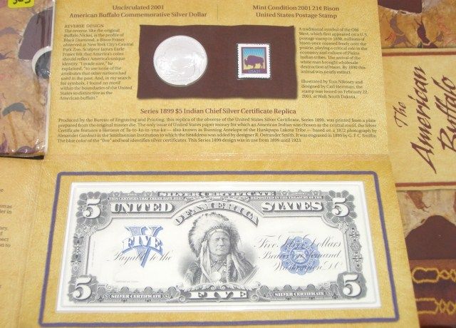 2001 AMERICAN BUFFALO COIN-STAMP & CURRENCY SET *RARE UNCIRCULATED SET*!! THIS SET COMES WITH THE 2001 COMMEMORATIVE SILVER DOLLAR/MINT CONDITION 1987 10 CENT RED CLOUD POSTAL STAMP & THE SERIES 1899 $5 INDIAN CHEIF SILVER CERTIFICATE REPLICA IN MINT CONDITION!! SET COMES IN ORIGINAL PACKAGE & CAME OUT OF SAFE!! ***Coin, Currency & All Items Listed in this auction - Grades, Conditions and Values are not Safe Deposit Coins LLC Responsibilty. Grades, Condition and Values are determined by Consigner(s) & Buyers ONLY