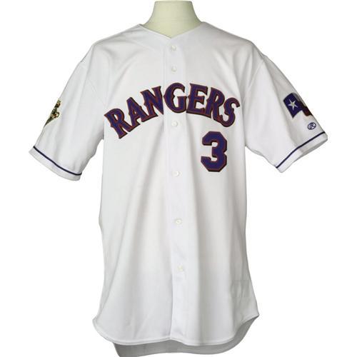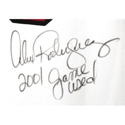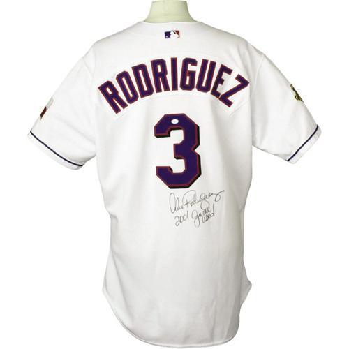 <B>2001 Alex Rodriguez Game Rangers Jersey.</B></I> A league-leading fifty-two home runs, 133 runs scored and eighty-seven extra base hits seemed to justify the twenty-five million dollar paycheck that brought A-Rod to Texas this season, where he suited up for the first time in a home white Rangers jersey such as this one. Team nickname and number "3" offer a southwestern feel on the chest, with "Rodriguez 3" on verso. Lone Star state flag and American League centennial patches adorn left and right sleeves respectively. "Rawlings Authentic Collection" label in tail is bristling with flap tags: "2 Inch Extra Length, 1 Inch Extra Sleeve Length, 50, Set 1 2001." Signed in perfect black sharpie on verso, "Alex Rodriguez, 2001 Game Used." Letter of authenticity comes from Alex' personal marketing company, and is signed by Rodriguez himself. <I>LOA from Lou Lampson.</B></I> <BR><BR><B>Important notice:</B> Heritage usually auctions material at the rate of 200-250 lots per hour. On some occasions eBay Live bid software or the Internet may not be able to keep up with the pace of the auction. We recommend placing a realistic absentee bid now as insurance to avoid disappointment. Occasionally the auctioneer may eliminate or reject an eBay Live bid, and the auctioneer may also reopen a lot after the close of the eBay live bidding (usually because we missed an audience bid), and may reject your bid even if it shows you as the winning bidder. By bidding via eBay Live, you agree that Heritage may award the lot to another bidder at its sole discretion under the circumstances described above or any other reasonable circumstances. Since eBay bids are not shown to us until we open the lot on the floor, we treat those bids just like floor bids. In most cases the floor responds before the eBay bid is presented to us, due to Internet lag time, so for consistency we have made it a policy that floor bids are always considered first over tie eBay live bids. Also please note that all Heritage lots purchased through eBay Live carry a 22.5% Buyer's Premium. Please make sure you read the Terms and Conditions before you bid. This lot is being auctioned in conjunction with a live floor auction by Heritage Galleries & Auctioneers. All final auction and invoice information will be supplied by Heritage Galleries & Auctioneers, and all other information should be considered preliminary. Lot:19674 <BR><BR><B>Winning Notification and Billing:</B> After the FINAL session in this auction is complete, Heritage will send e-mail and snail mail invoices. This process normally takes several days. All final auction and invoice information will be supplied by Heritage Galleries & Auctioneers, and all other information should be considered preliminary. <BR><BR>This auction will be conducted on a live auction floor and over the Internet through eBay Live. If you choose to place an absentee bid, please take a moment to <font color='#0000ff'><u><a href='http://pages.ebay.com/liveauctions/help/before/laabsentee.html'>learn how eBay Live absentee bidding works</a></u></font><font color='#000000'>