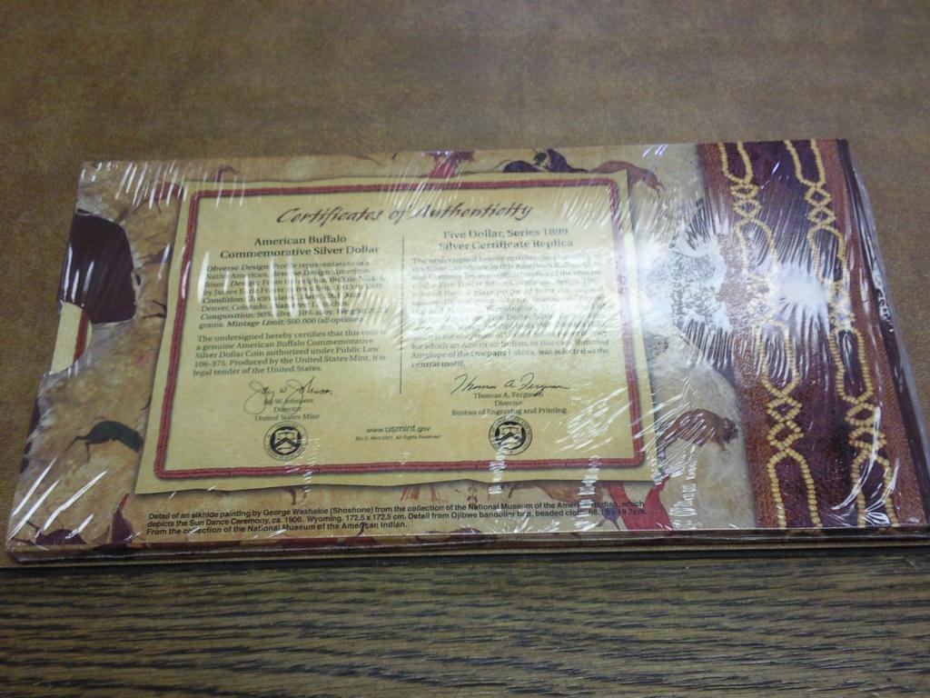 Contains: UNC American Buffalo Silver Dollar, Face Reprint Of 1899 $5 Indian Chief Silver Certificate, 1987 Chief Red Cloud 10 Cent Stamp And 2001 Bison 21 Cent Stamp, Sealed