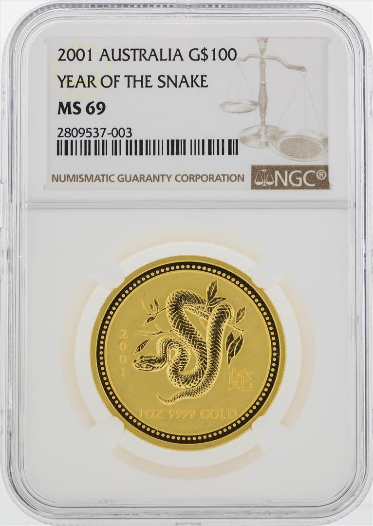 One 2001 Australia $100 Year of the Snake Gold Coin NGC MS69. NGC Certified.
