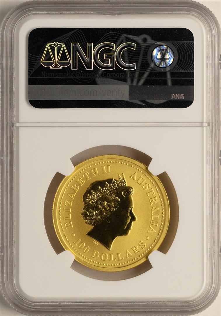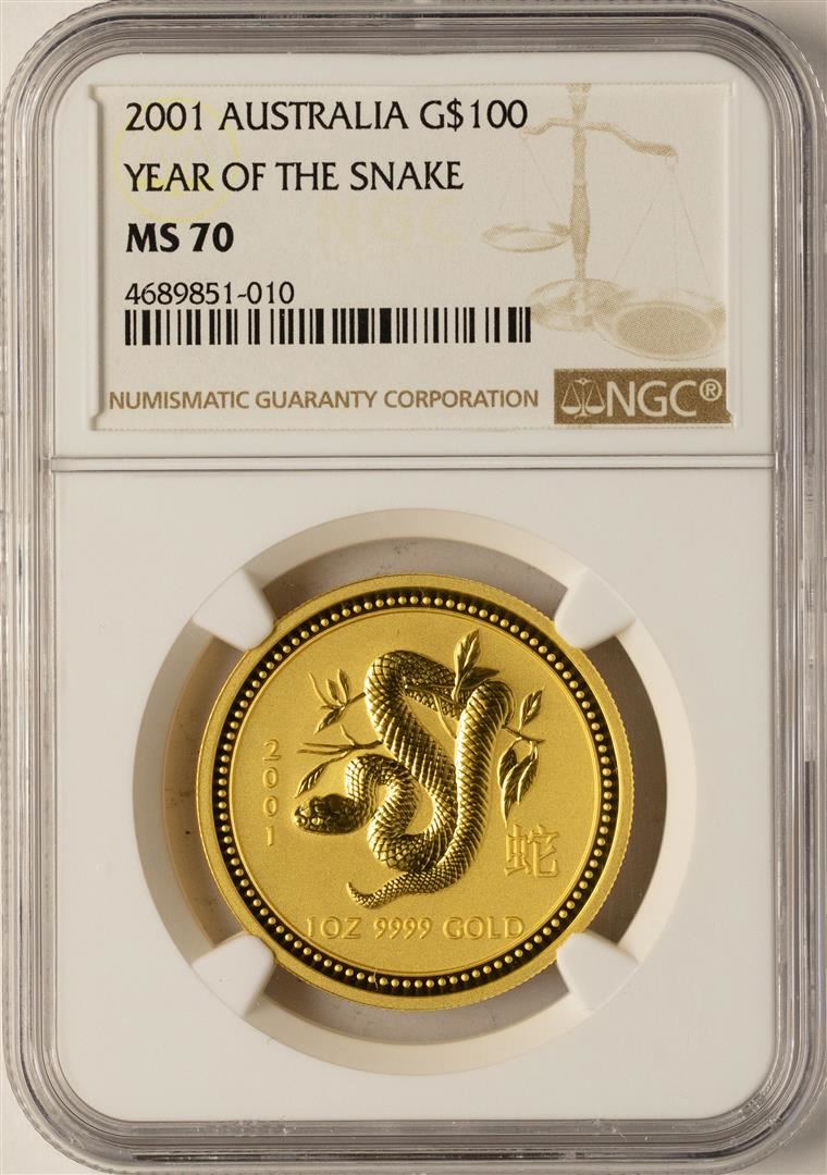 One 2001 Australia $100 Year of the Snake Gold Coin NGC MS70. NGC Certified.