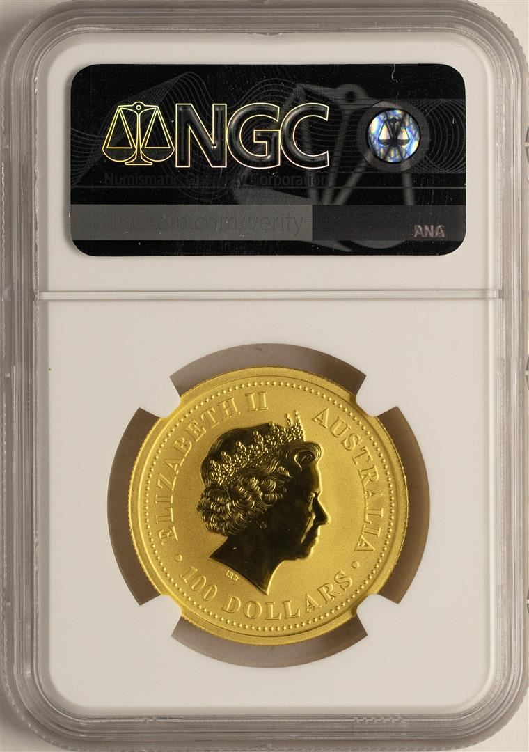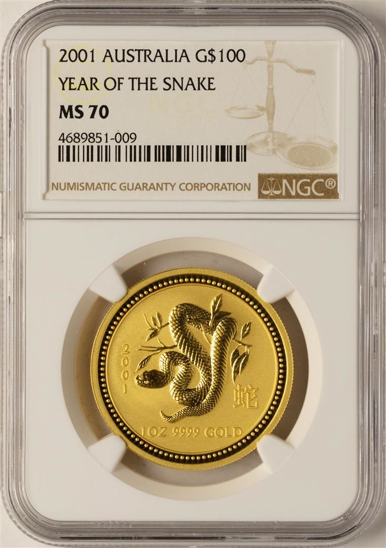 One 2001 Australia $100 Year of the Snake Gold Coin NGC MS70. NGC Certified.