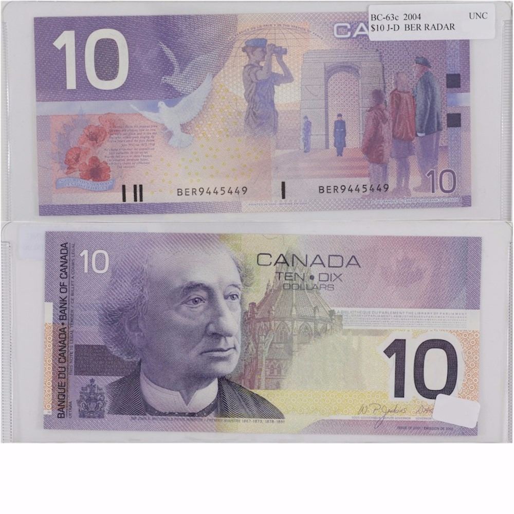 2001 Bank of Canada $10 RADAR. BC-63c, in UNC Condition. S/N: BER9445449.