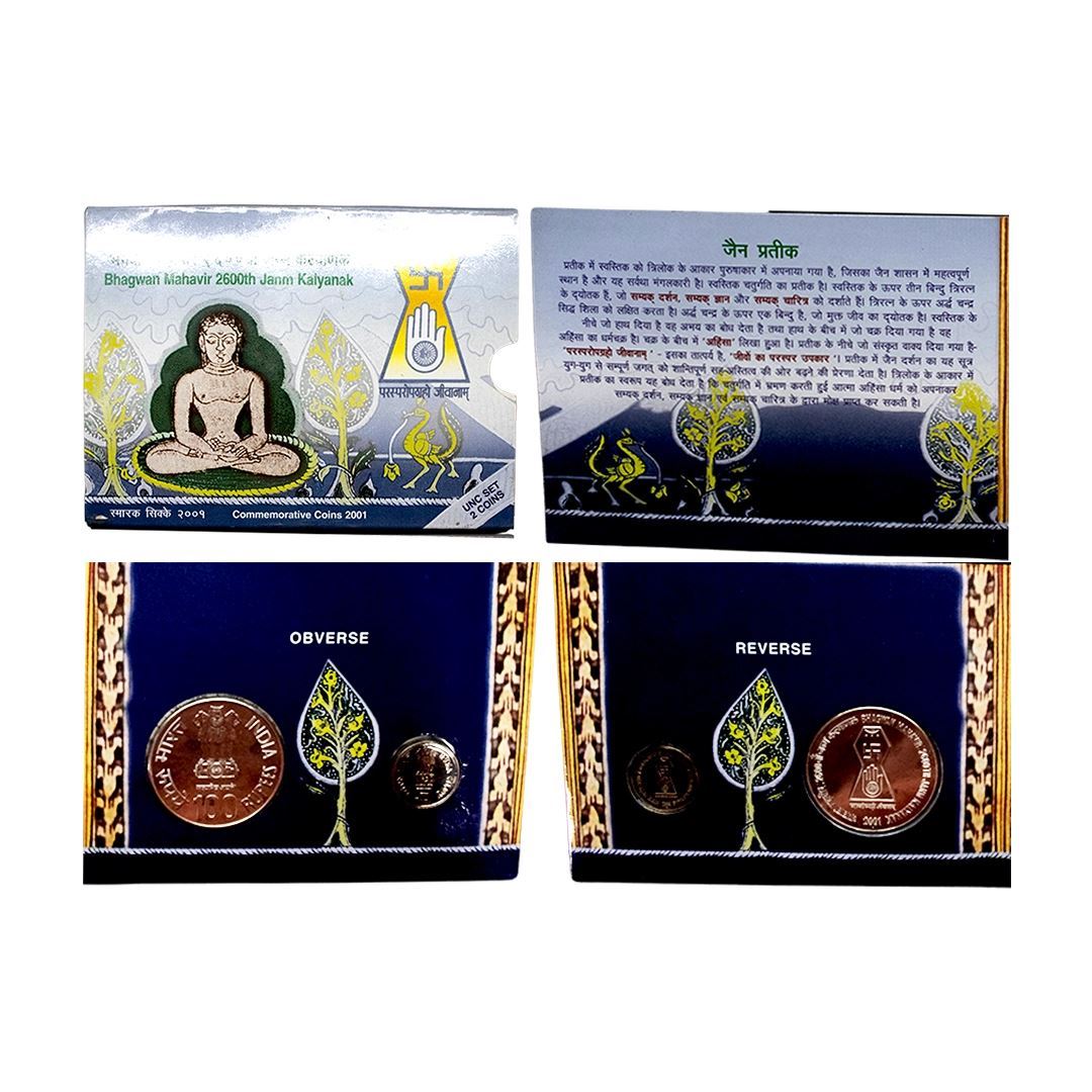 2001, Bhagwan Mahavir-2600th Janm Kalyanak, UNC set of 2 coins, 100 rupees and 5 rupees, Mumbai mint