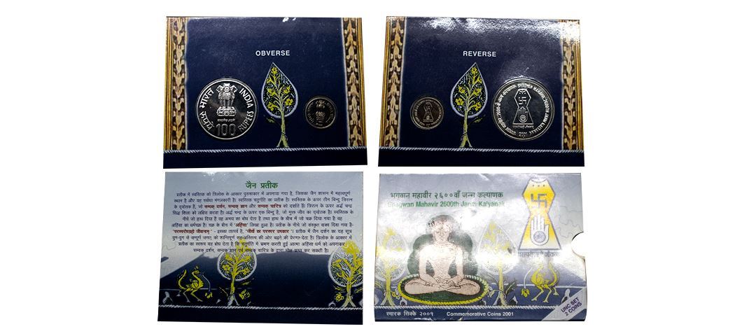 2001, Bhagwan Mahavir-2600th Janm Kalyanak, UNC set of 2 coins, 100 rupees and 5 rupees, Mumbai mint