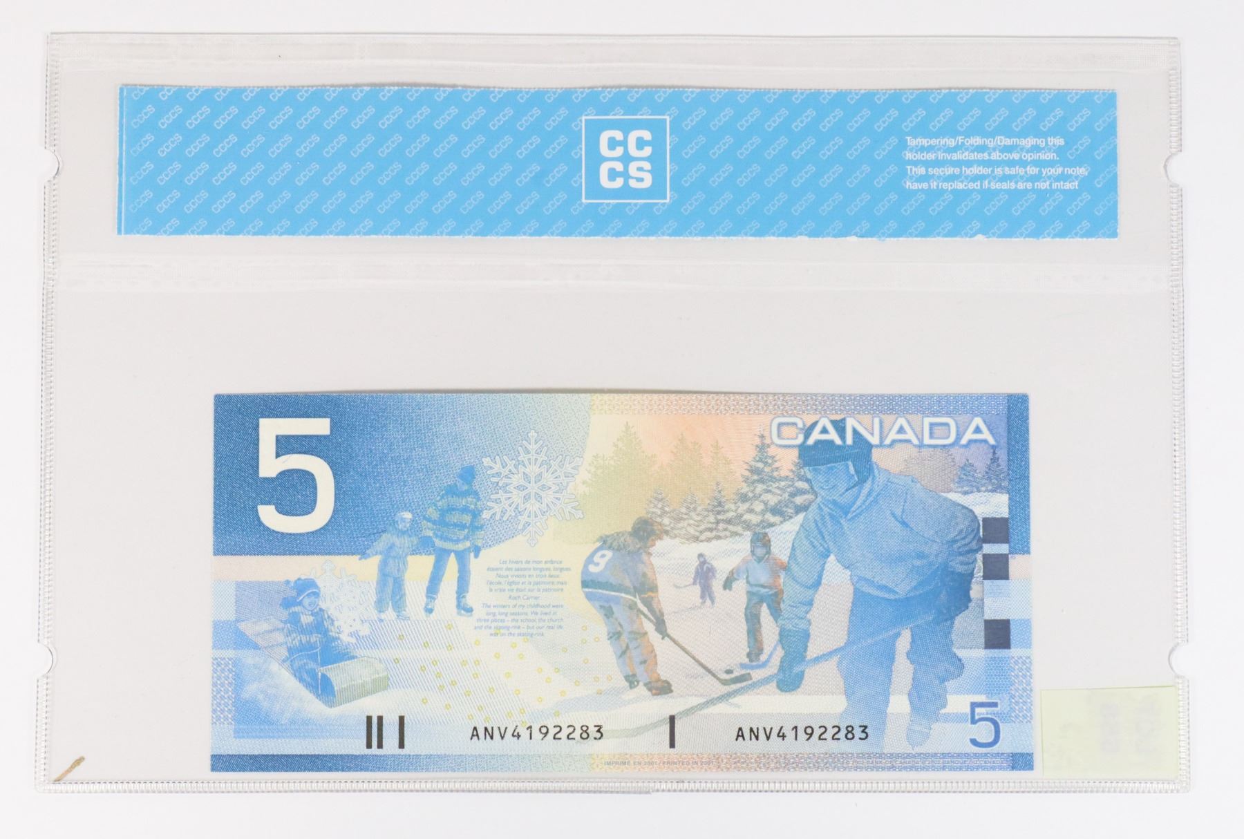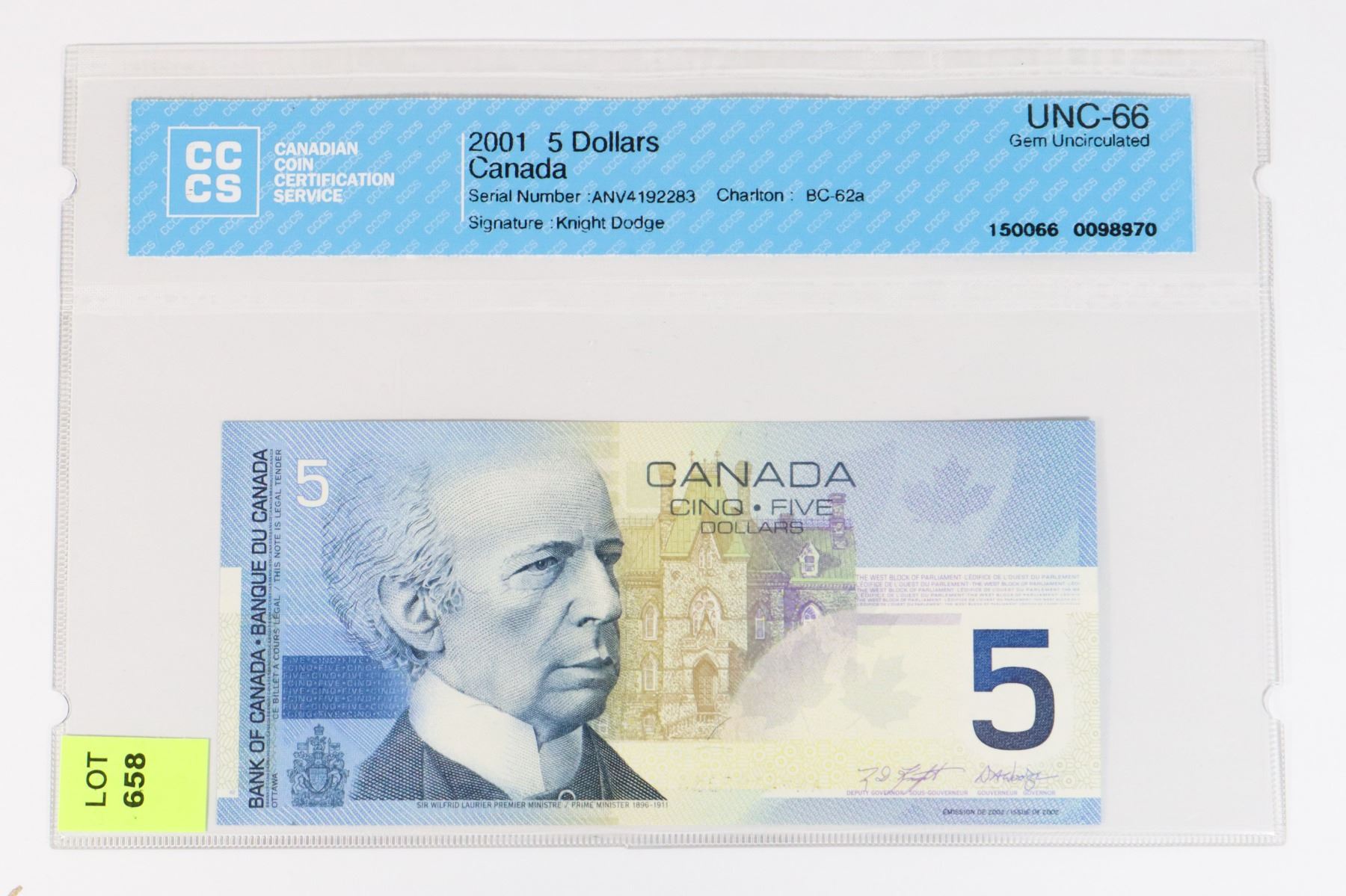 2001 CANADIAN 5 DOLLAR BANK NOTE GRADED UNC-66 BY