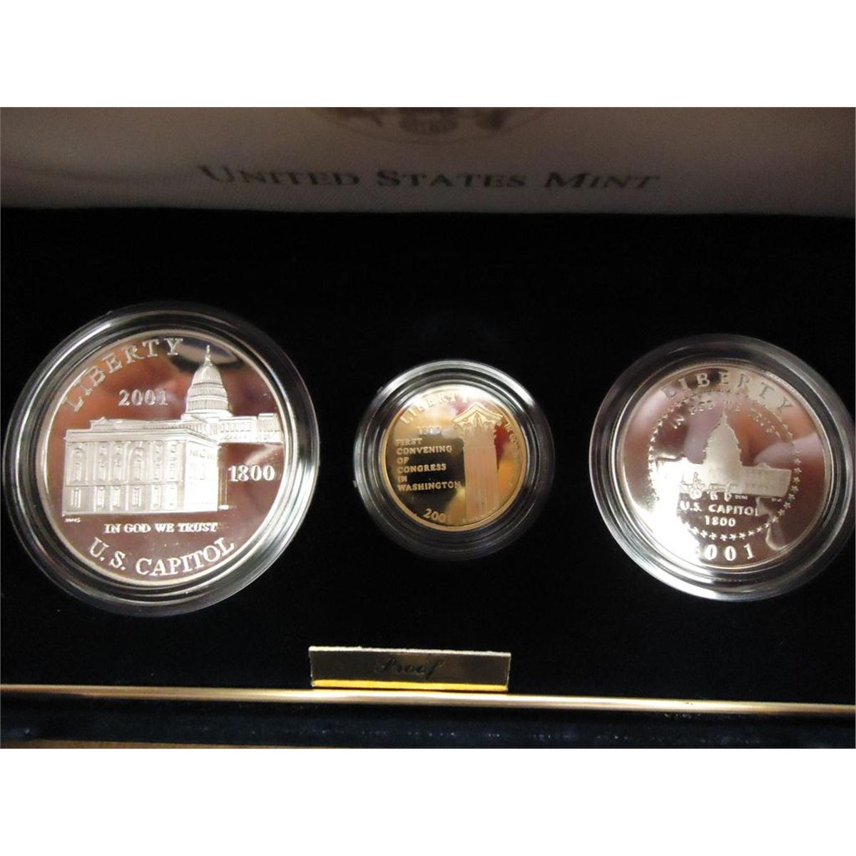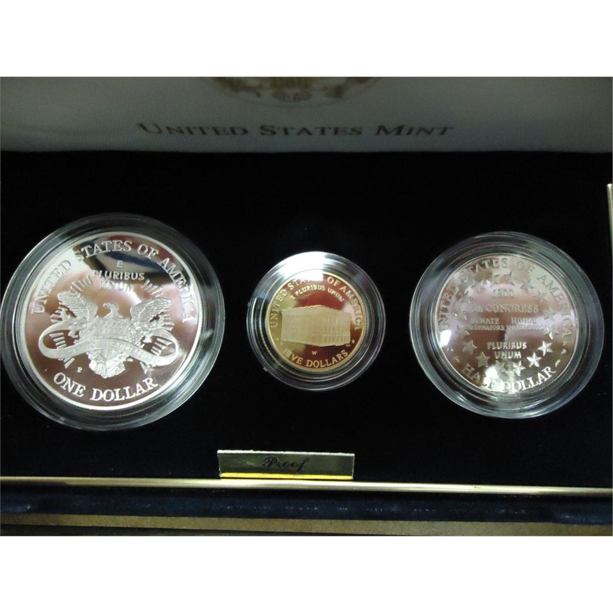 CLAD HALF DOLLAR, SILVER DOLLAR AND GOLD $5 COIN, ORIGINAL US MINT PACKAGING