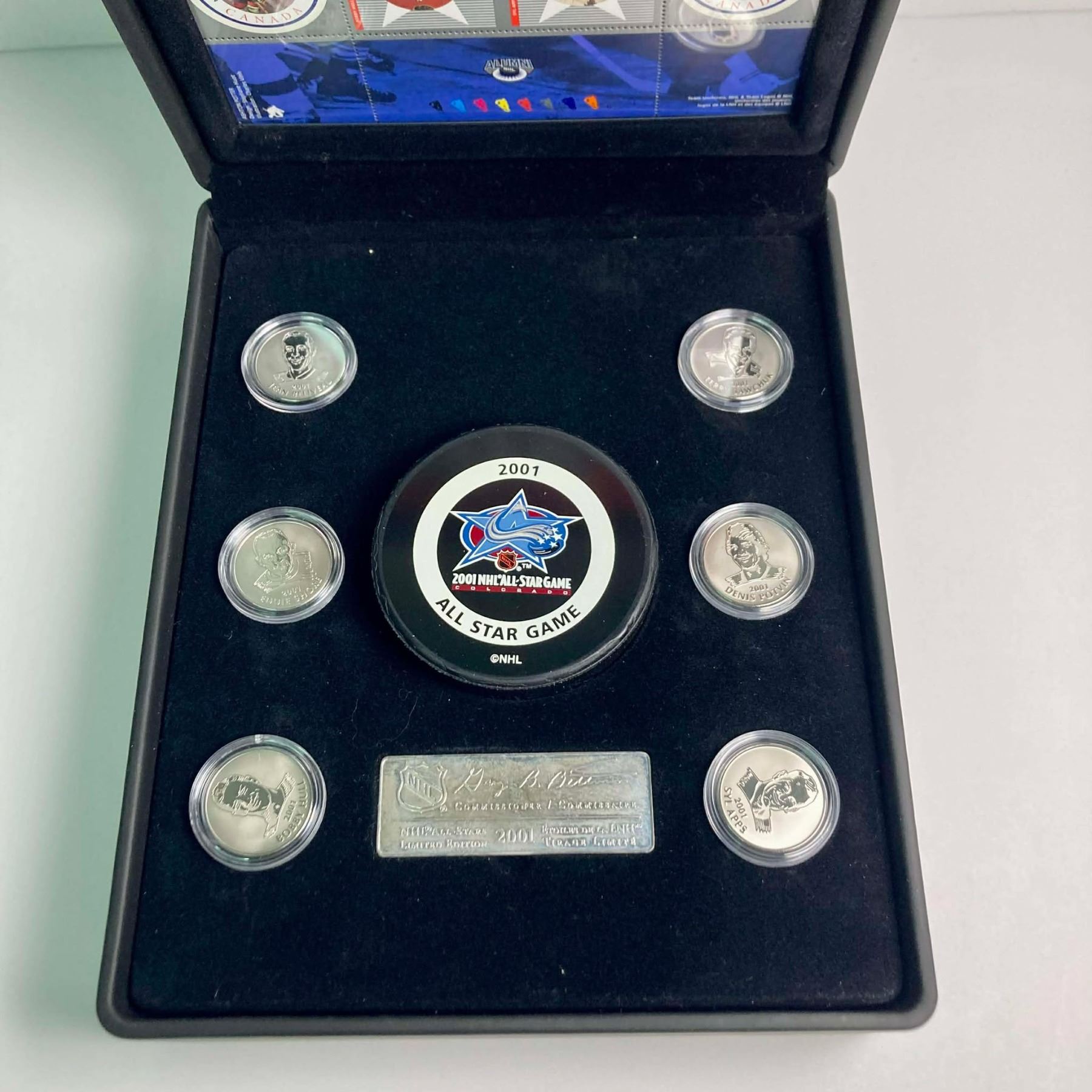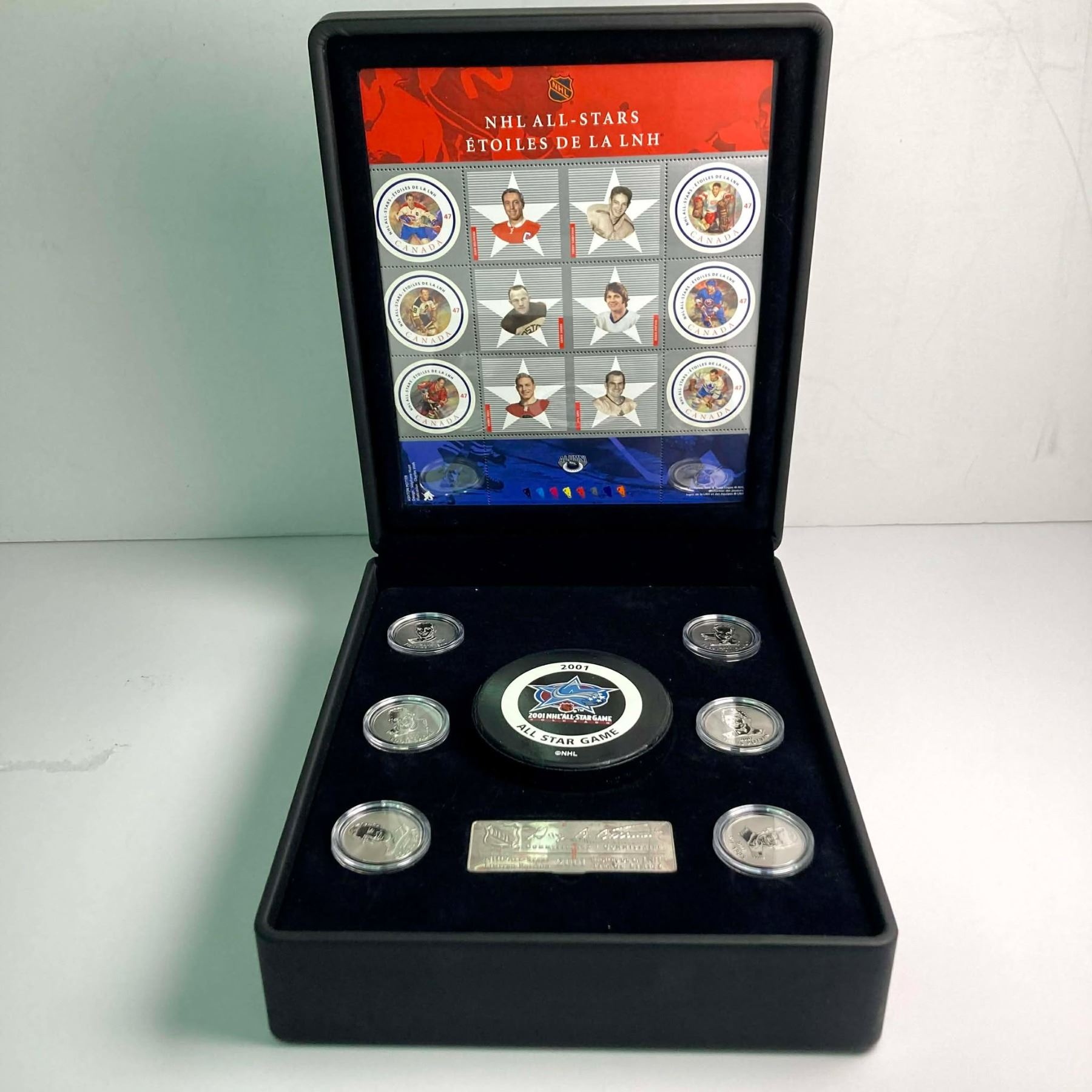 Puck, medals, and stamps. Nice set from Canada Post and Royal Canadian Mint. In case, which shows some wear, no outer packaging.