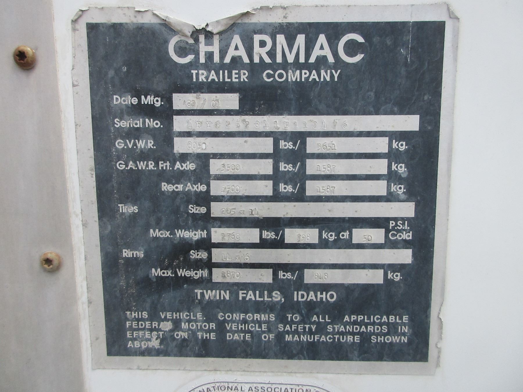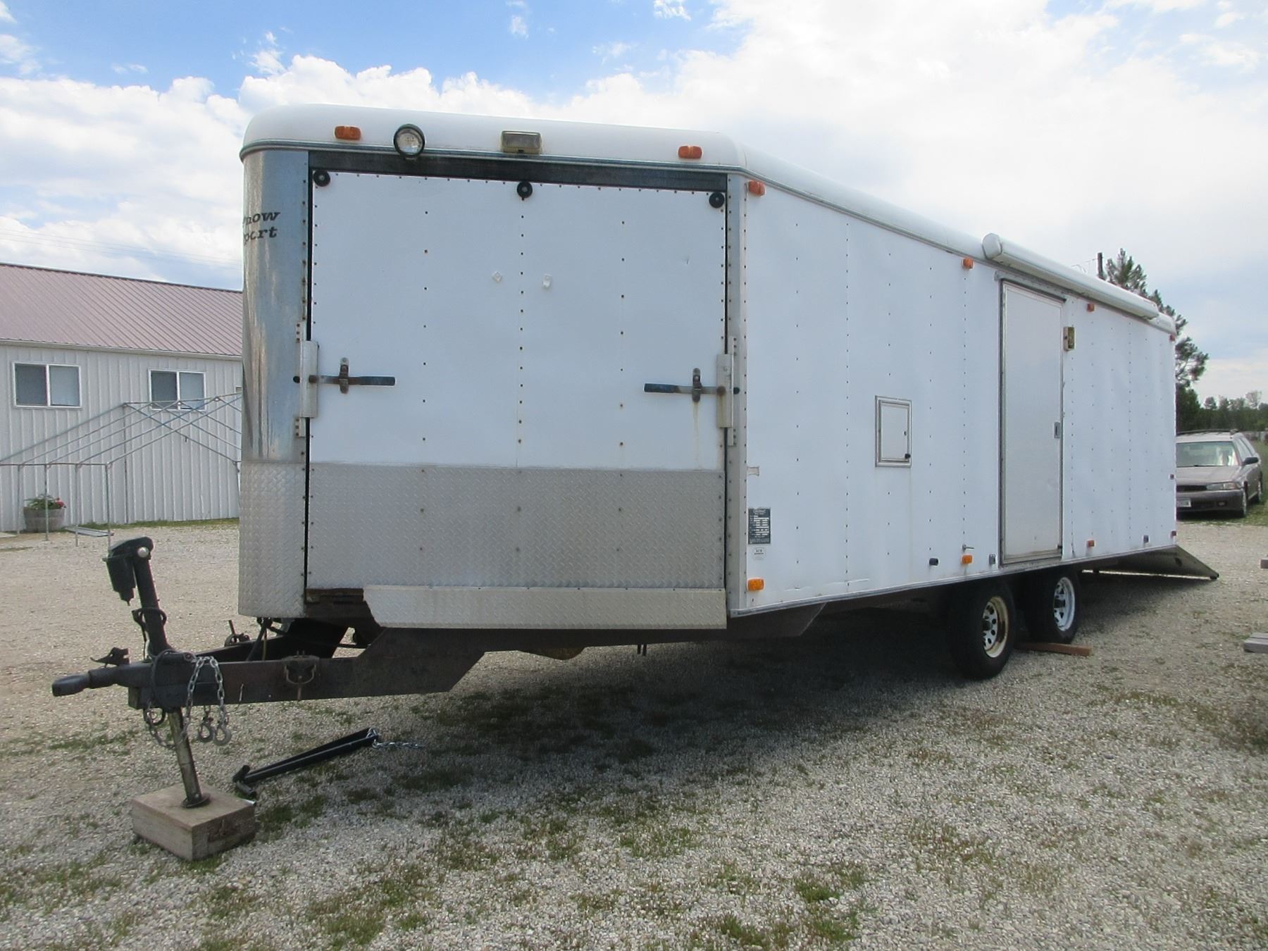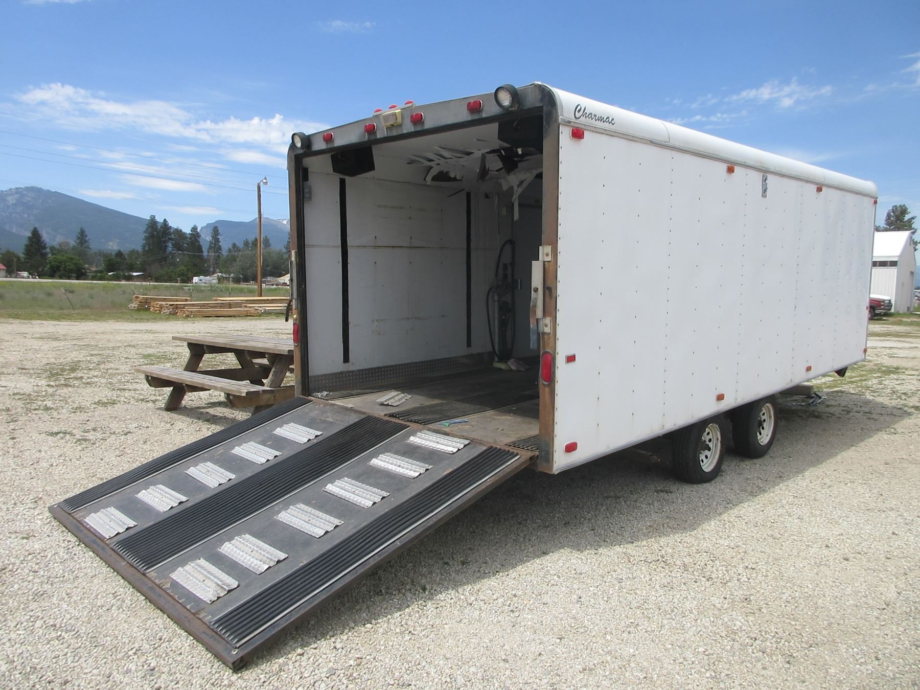 2001 Charmac Snow Sport V Nose Snowmobile Trailer- 26.5' X 8.5'- Tandom Axle- Rear Ramp Door- V Nose Ramp Door- Man Door- All With Tread- Gas Tank With Pump- Heater- Stereo- Leveling Jacks- Electric Jack- The Roof Did Leak But Has Been Repaired- Ceiling Has Water Damage- Pigtail To Pickup And Electric Jack Needs Rewired- Pulls Good- Decent Condition- Clear Title