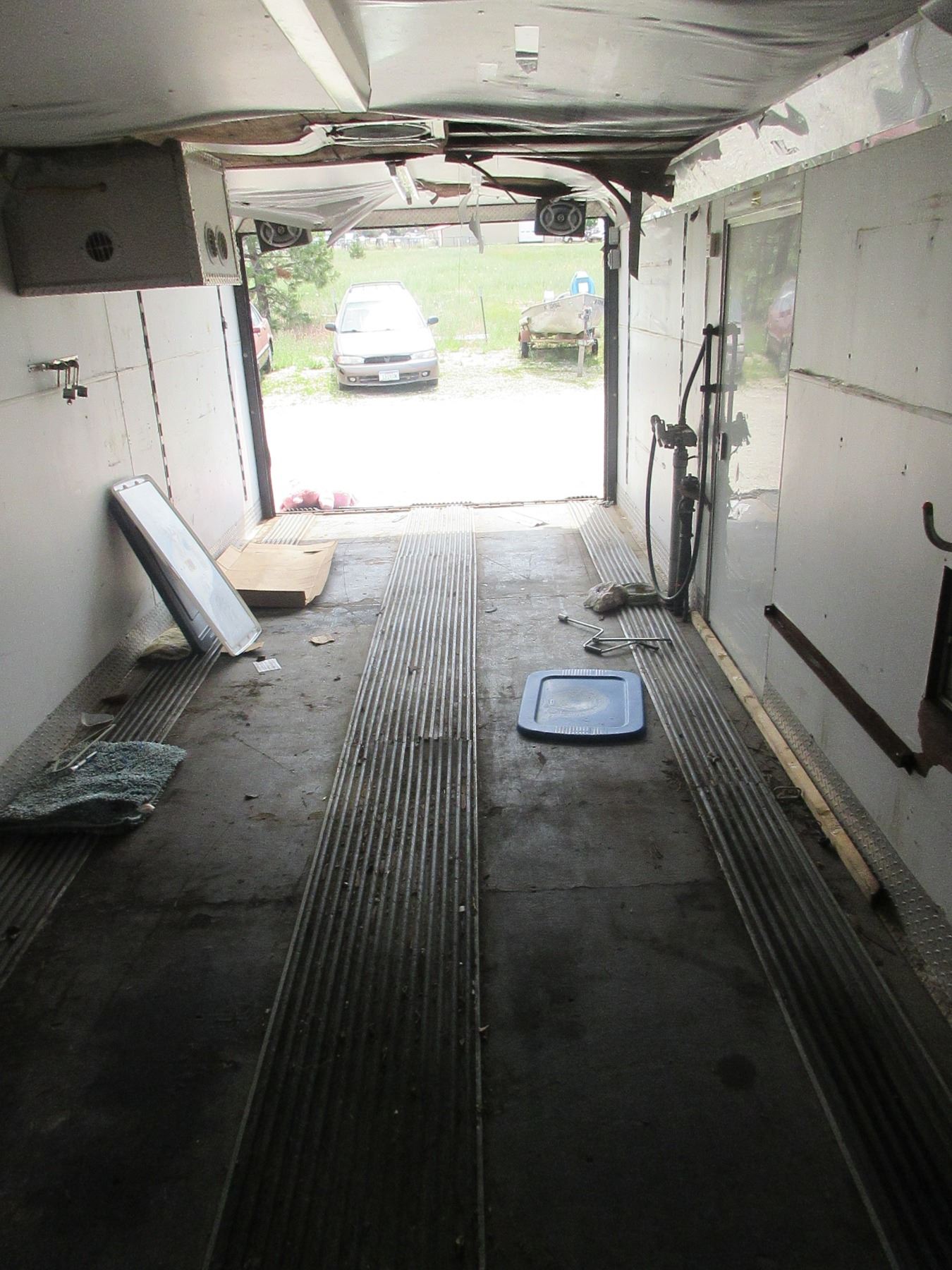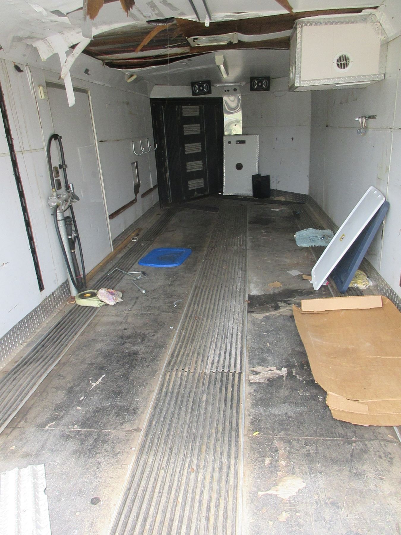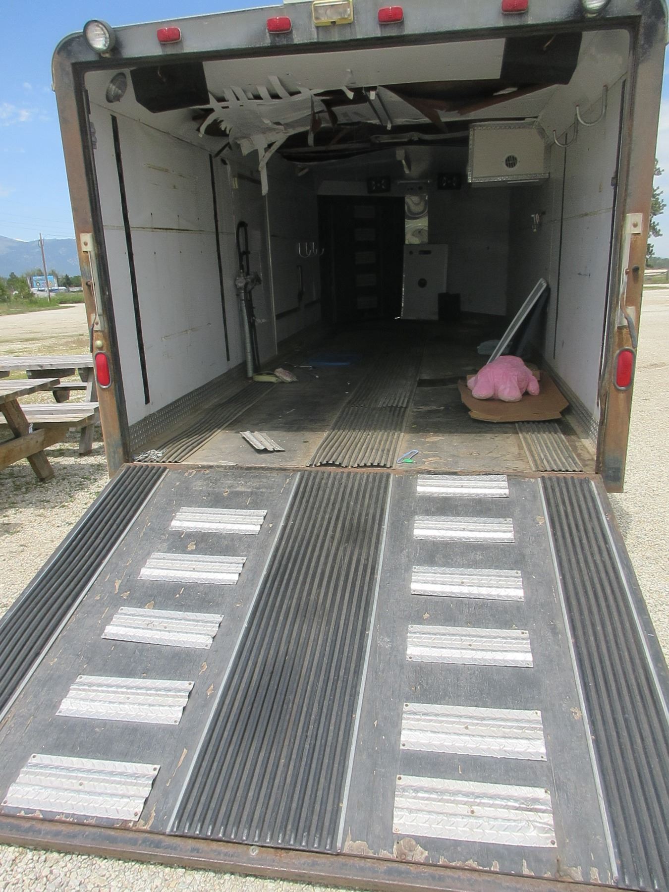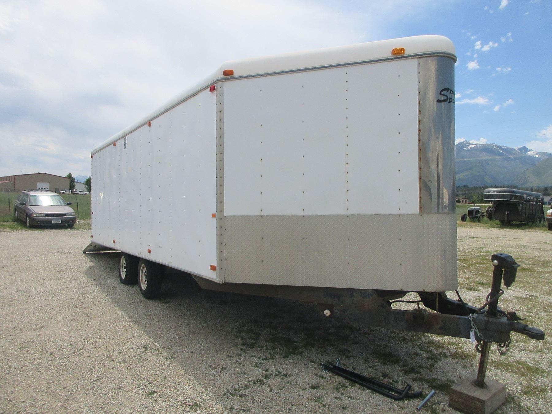 2001 Charmac Snow Sport V Nose Snowmobile Trailer- 26.5' X 8.5'- Tandom Axle- Rear Ramp Door- V Nose Ramp Door- Man Door- All With Tread- Gas Tank With Pump- Heater- Stereo- Leveling Jacks- Electric Jack- The Roof Did Leak But Has Been Repaired- Ceiling Has Water Damage- Pigtail To Pickup And Electric Jack Needs Rewired- Pulls Good- Decent Condition- Clear Title