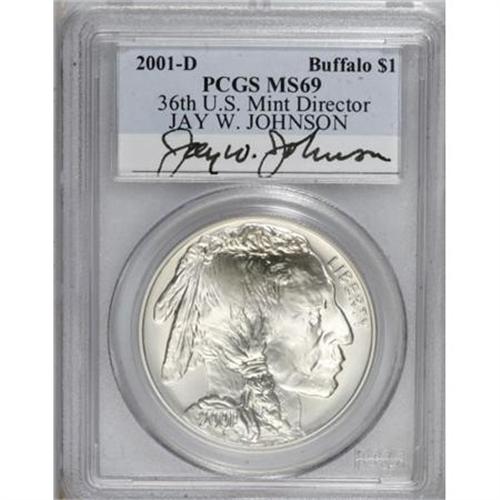 <B>2001-D $1 Buffalo Silver Dollar MS69 PCGS.</B></I> Jay W. Johnson. PCGS Population (8184/122). NGC Census: (0/0). Numismedia Wsl. Price for NGC/PCGS coin in MS69: $228. (#9793)<BR><BR><b>Shipping:</b> Coins & Currency (<a target="_blank" href="http://www.heritageauctions.com/common/shipping.php">view shipping information</a>)