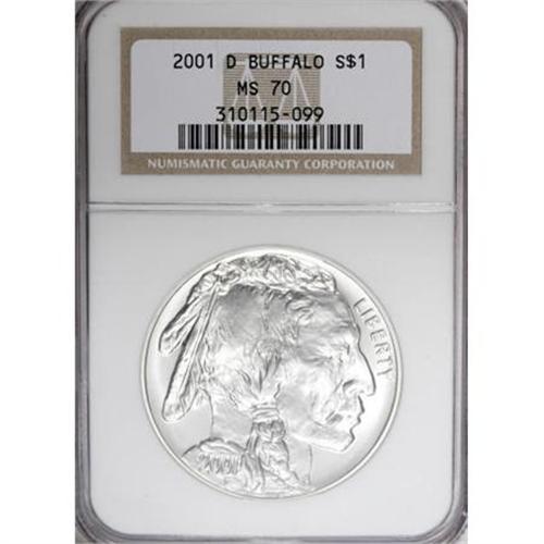 <B>2001-D $1 Buffalo Silver Dollar MS70 NGC.</B></I> With its faithful depiction of the old Buffalo nickel design, this modern silver dollar became very popular with collectors, and received a great deal of attention in the numismatic press. This spectacular piece is fully struck and pristine, with brilliant silver surfaces that have a deep satiny sheen. <BR><BR><b>Shipping:</b> Coins & Currency (<a target="_blank" href="http://www.heritageauctions.com/common/shipping.php">view shipping information</a>)