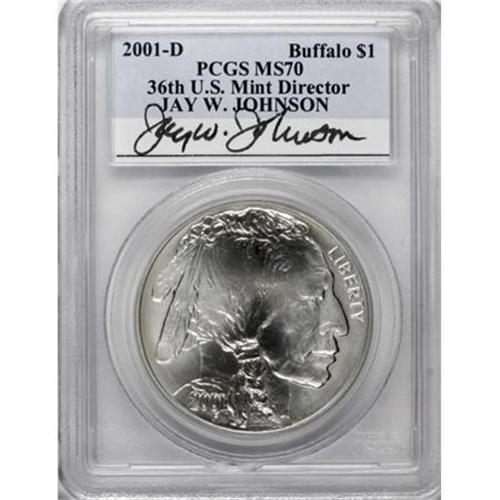 <B>2001-D $1 Buffalo Silver Dollar MS70 PCGS.</B></I> Fully struck, untoned, and seemingly pristine. A beautifully produced and immaculately preserved coin. The PCGS holder is signed by former Mint Director Jay Johnson.<BR><BR><b>Shipping:</b> Coins & Currency (<a target="_blank" href="http://www.heritageauctions.com/common/shipping.php">view shipping information</a>)