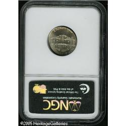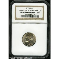 <B>2001-D 5C Jefferson Nickel--Struck on an Elliptical Planchet--MS63 Full Steps NGC.</B></I> 4.06 grams. Lustrous and lightly toned. Struck on an underweight and rather oval-shaped planchet, a typical Nickel should weigh 5 grams. The tops of several legends, including the date, UNUM, and TRUST, are partly off the flan. Lot:10967