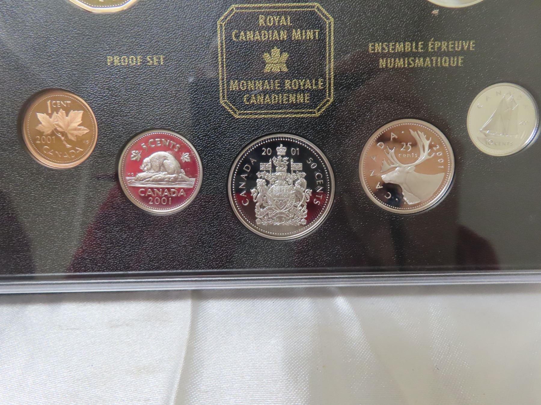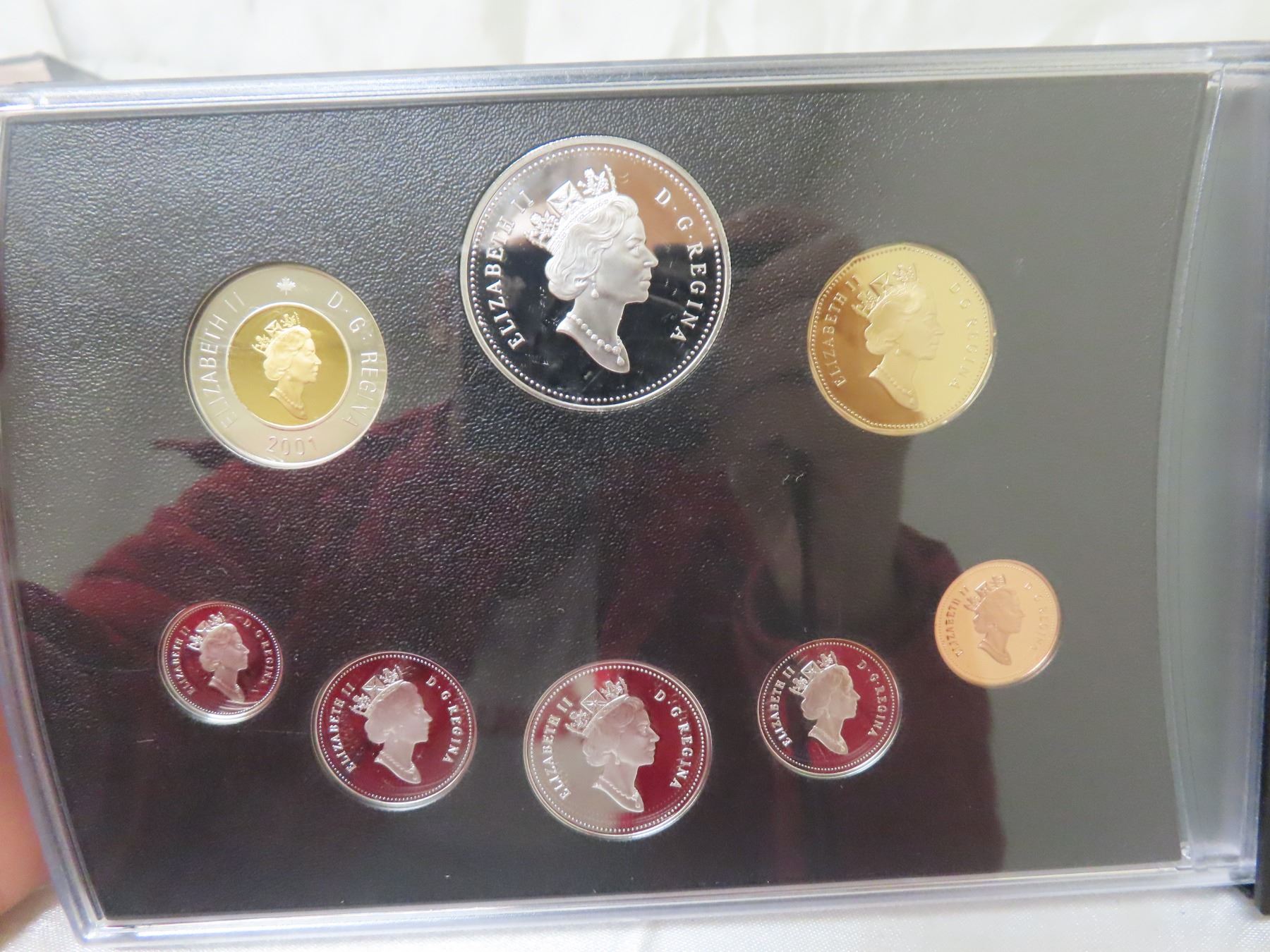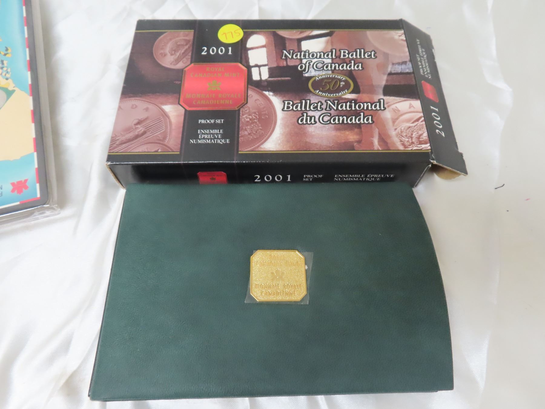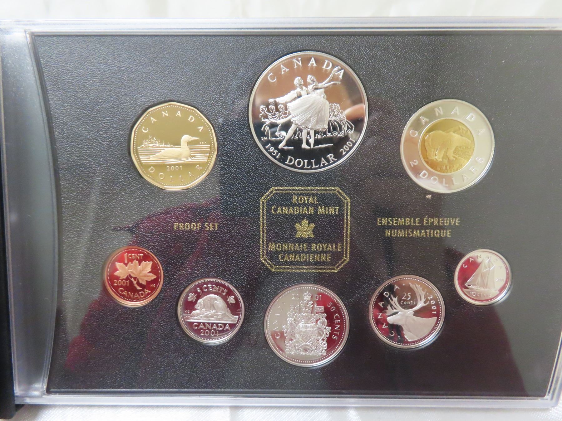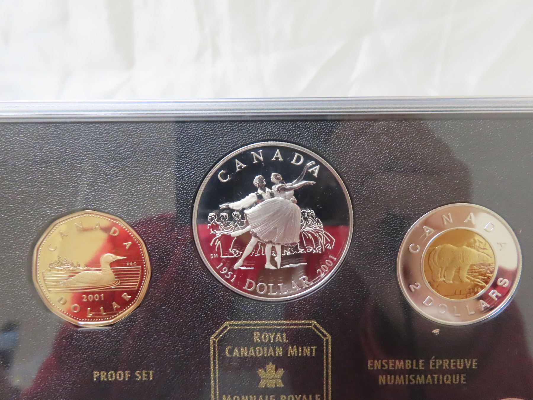 2001 Double Dollar Proof Set. Silver Dollar marks the 50th Anniversary of the National Ballet of Canada. 7-coin Proof Set. Most coins are Sterling Silver with the Toonie 24-karat Gold-Plated. All coins have Ultra Heavy Cameos. Housed in its original Royal Canadian Mint case of issue. Includes Certificate of Authenticity.